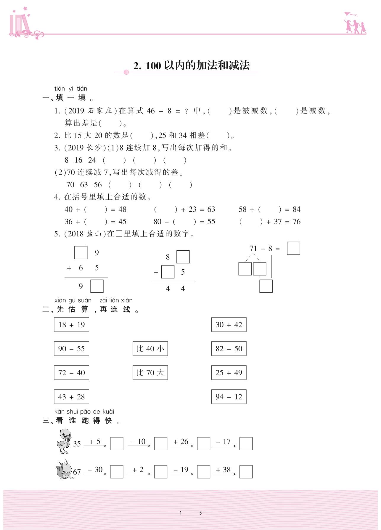 2021下册一年级数学冀教版 整理与评价——2. 100以内的加法和减法