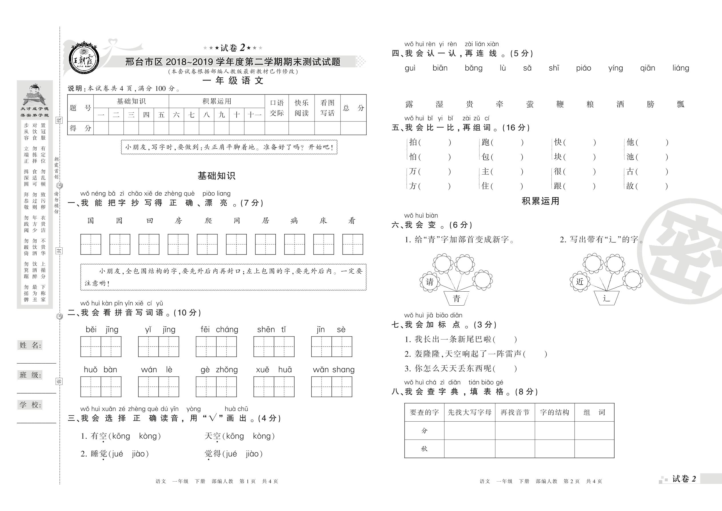 2018-2019学年第二学期邢台市区一年级语文试卷(人教版)【2】