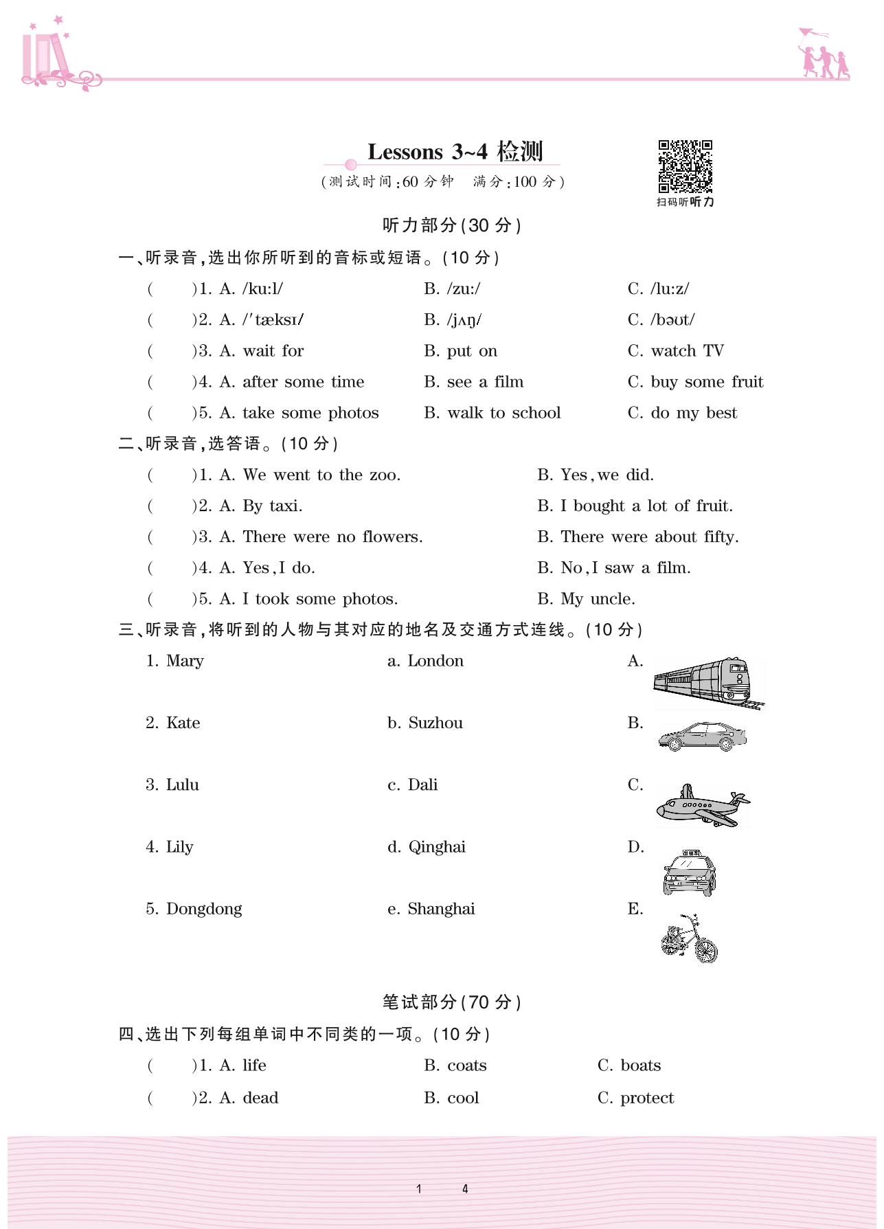 2021下册六年级英语科普版 Lessons 3~4检测