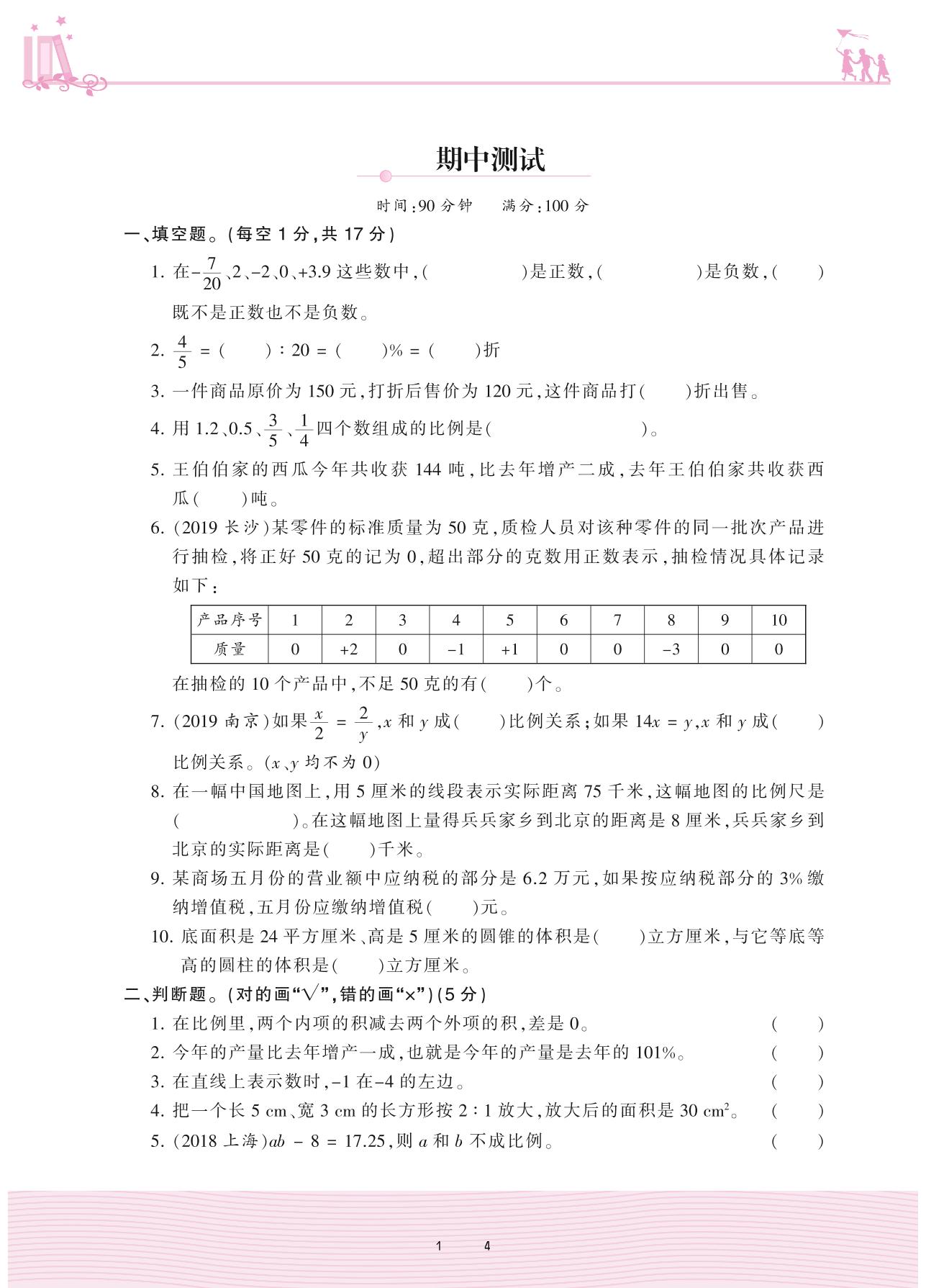2021下册六年级数学人教版 期中测试