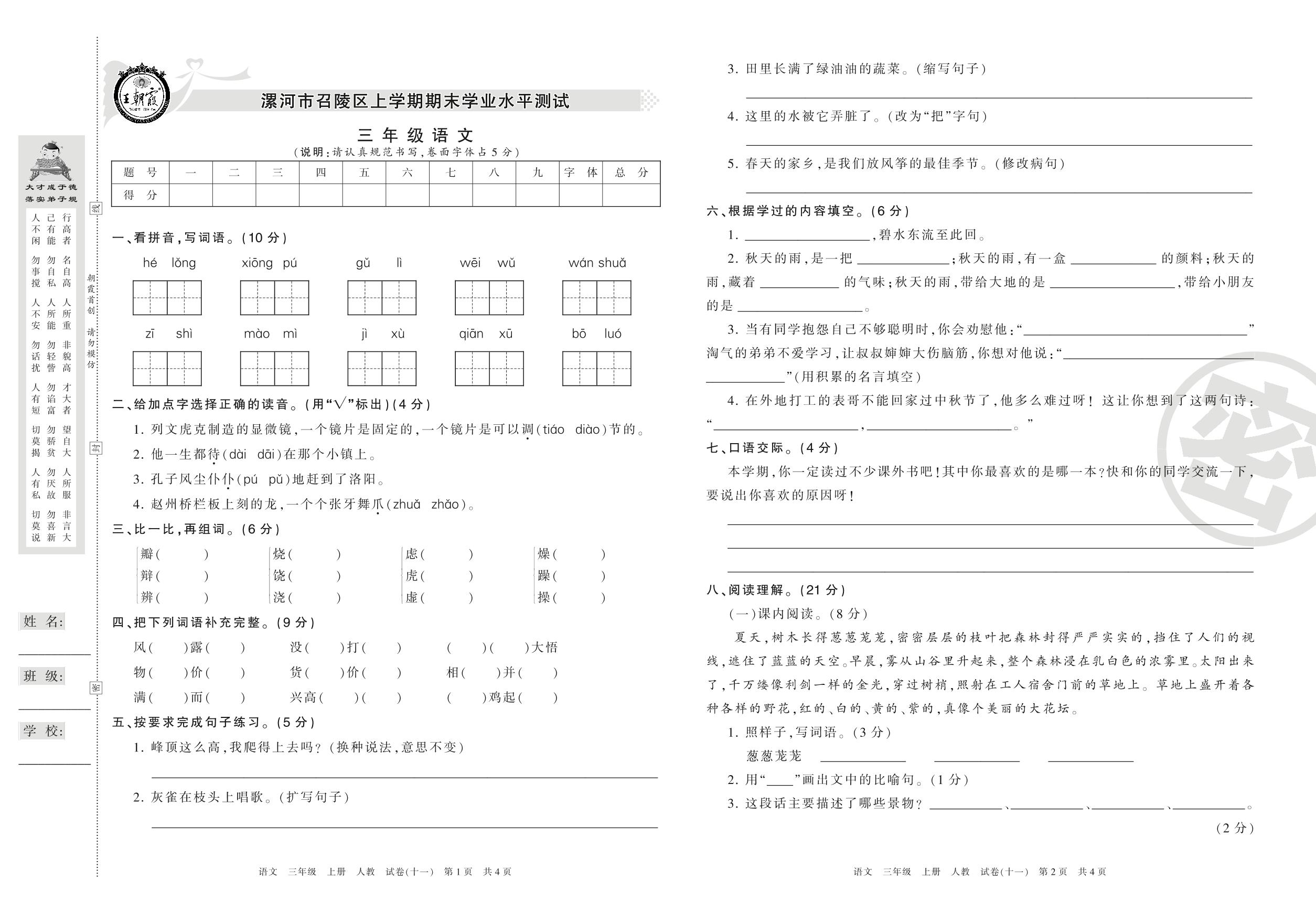 2016-2017学年第一学期漯河市召陵区三年级语文试卷(人教版)【11】