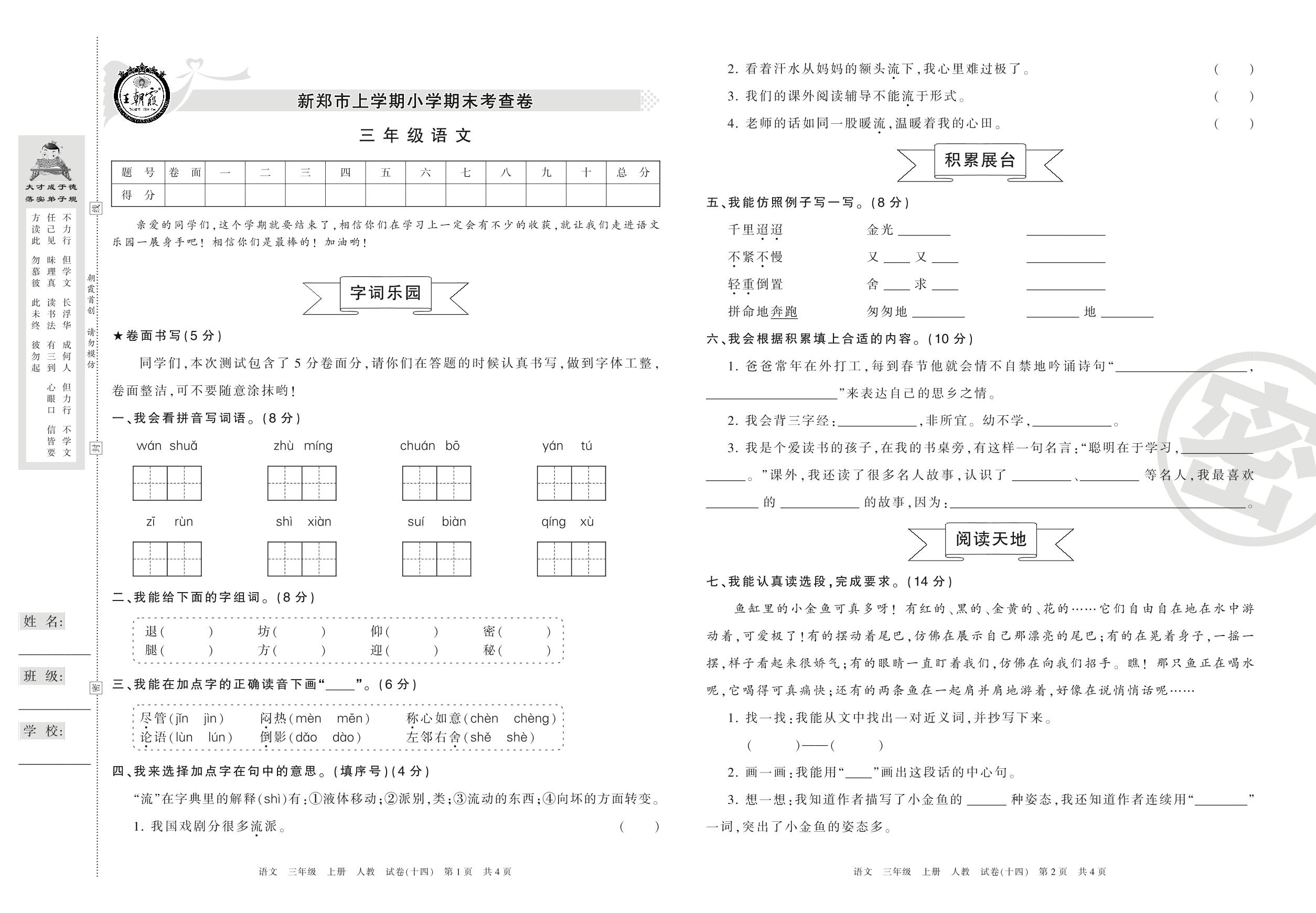 2016-2017学年第一学期新郑市三年级语文试卷(人教版)【14】