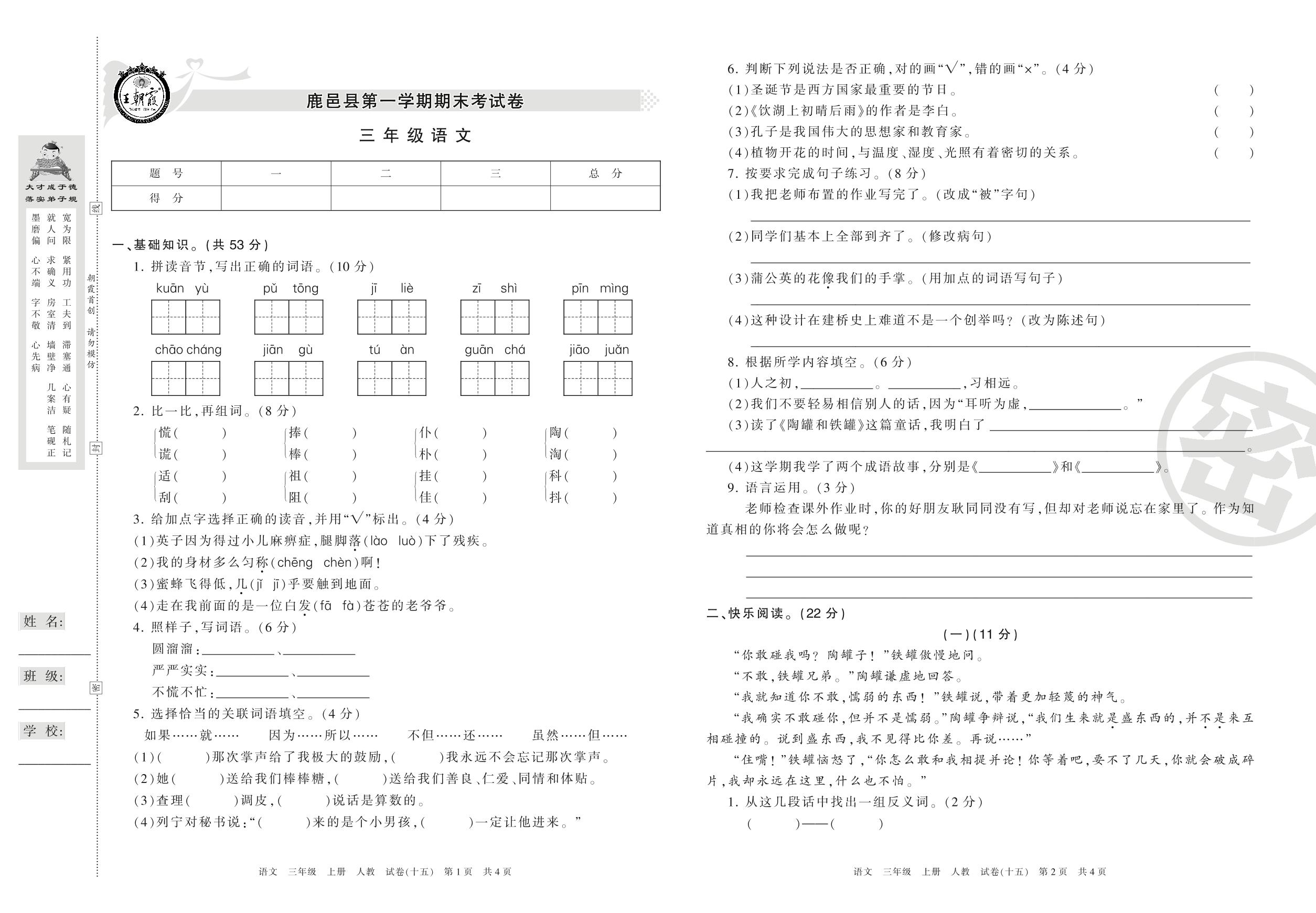2016-2017学年第一学期周口市鹿邑县三年级语文试卷(人教版)【15】
