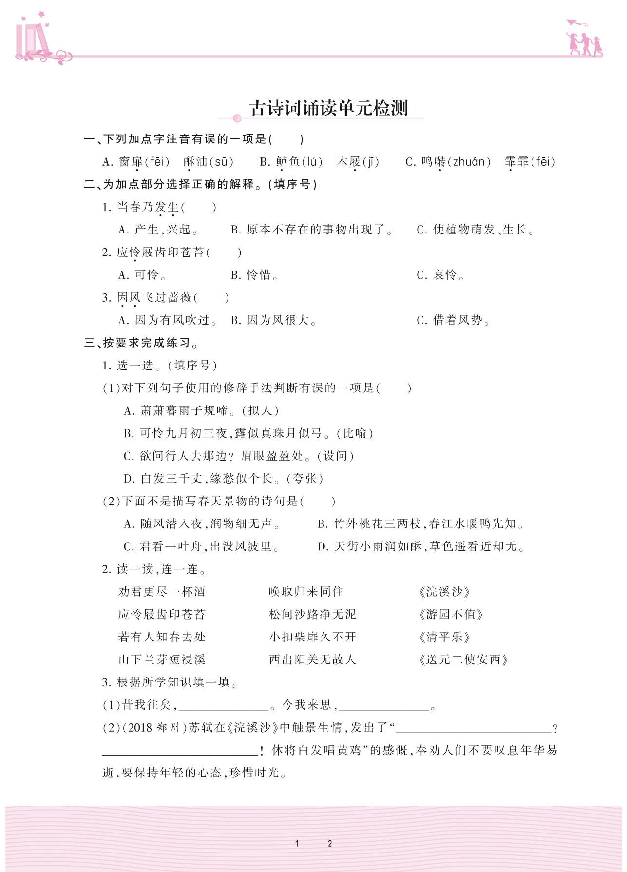 2021下册六年级语文人教版 古诗词诵读单元——古诗词诵读单元检测