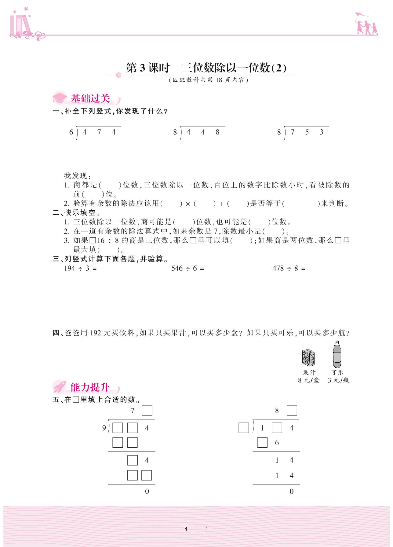 2021下册三年级数学人教版 2 除数是一位数的除法 2. 笔算除法——第3课时 三位数除以一位数(2)
