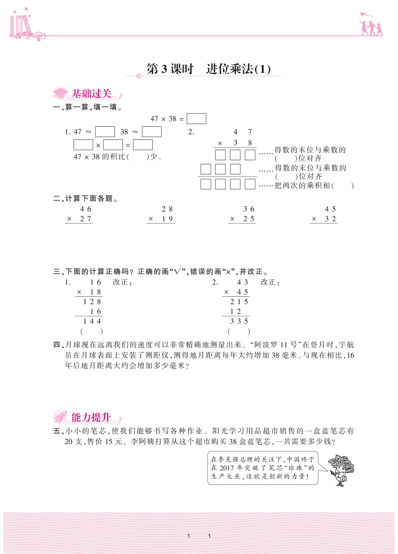 2021下册三年级数学人教版 4 两位数乘两位数 2. 笔算乘法——第3课时 进位乘法(1)