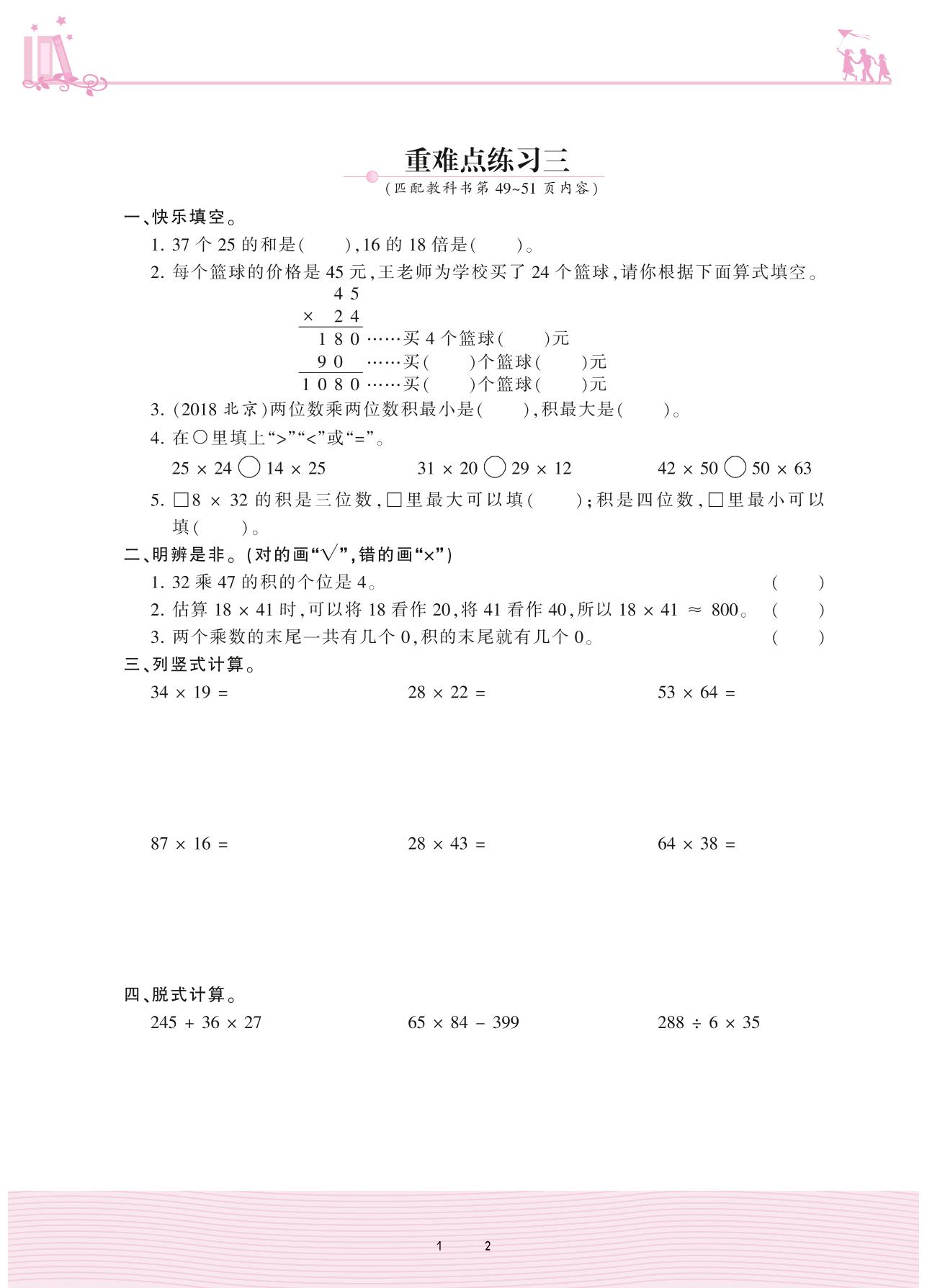 2021下册三年级数学人教版 4 两位数乘两位数——重难点练习三