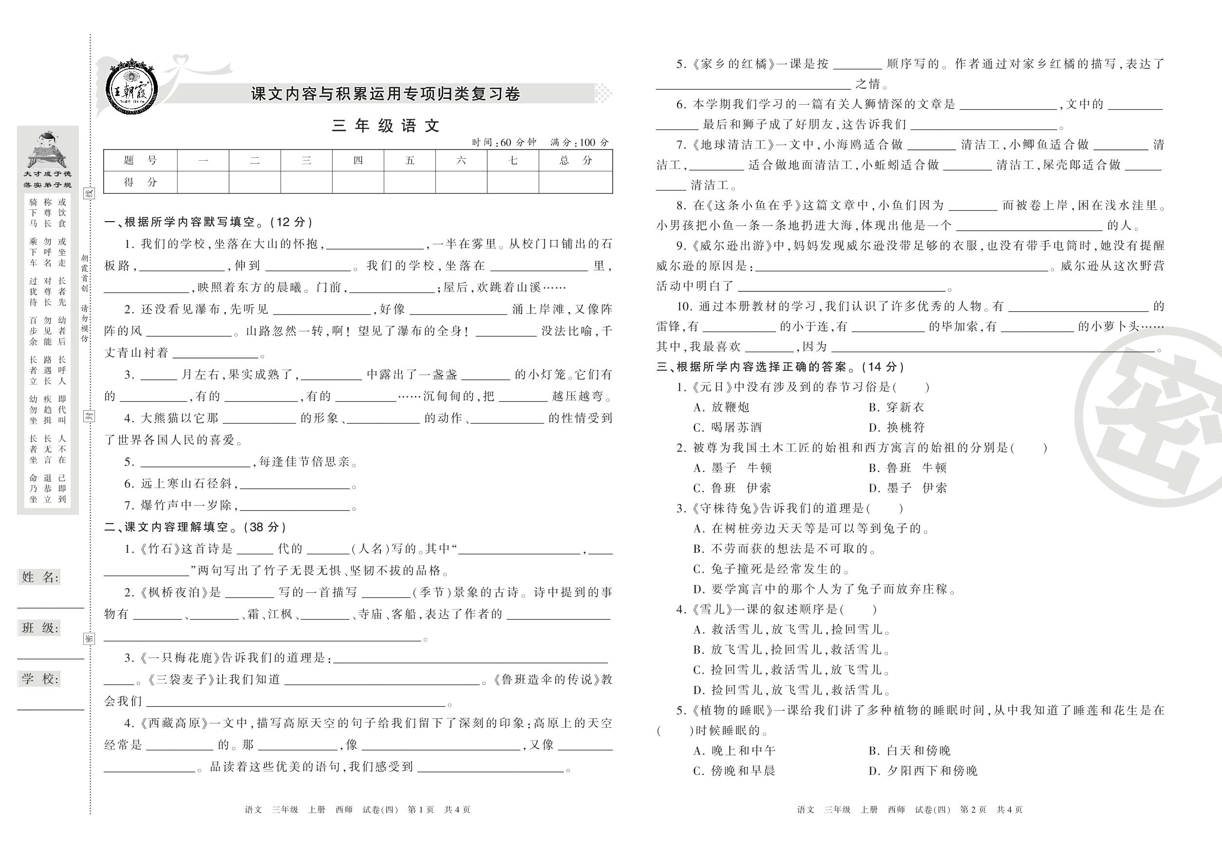 王朝霞期末专项卷三年级上册语文(西师版)_R210801100503【4】