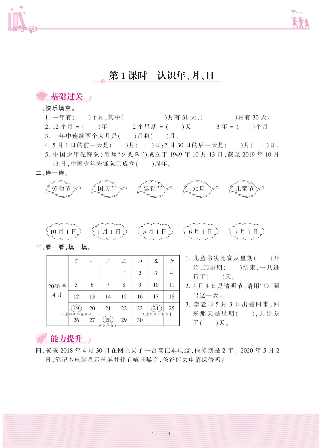 2021下册三年级数学人教版 6 年、月、日——第1课时 认识年、月、日