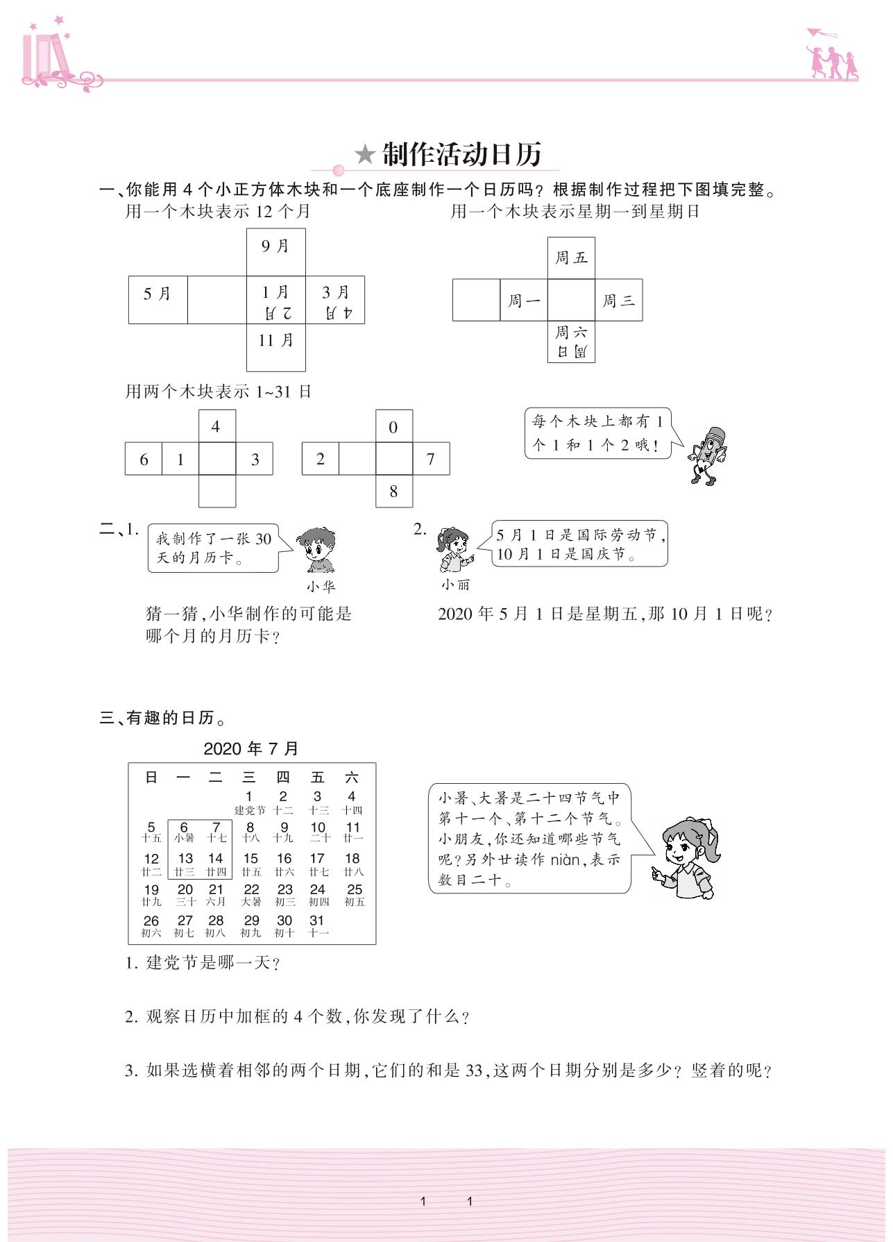 2021下册三年级数学人教版 6 年、月、日——制作活动日历