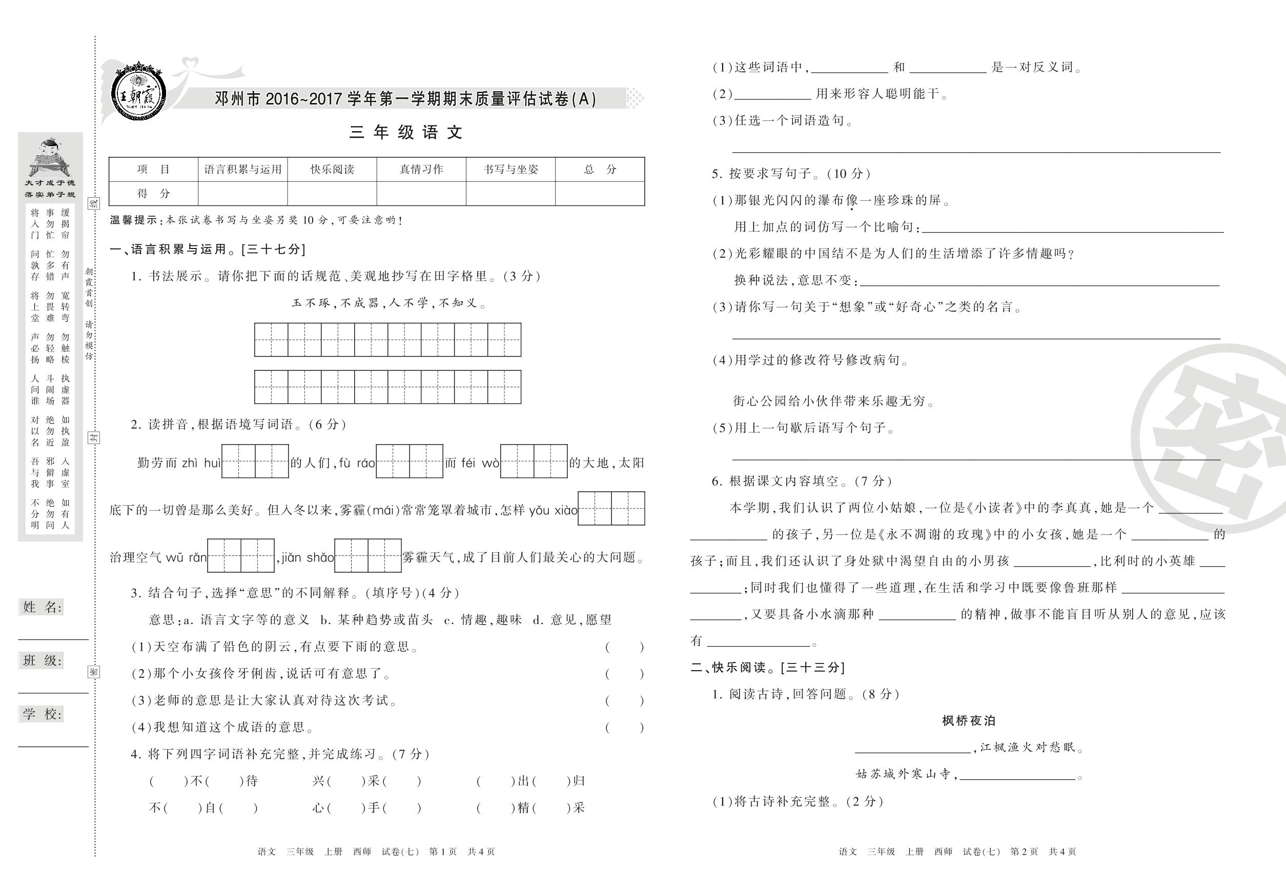 2016-2017学年第一学期邓州市三年级语文试卷(西师版)【7】