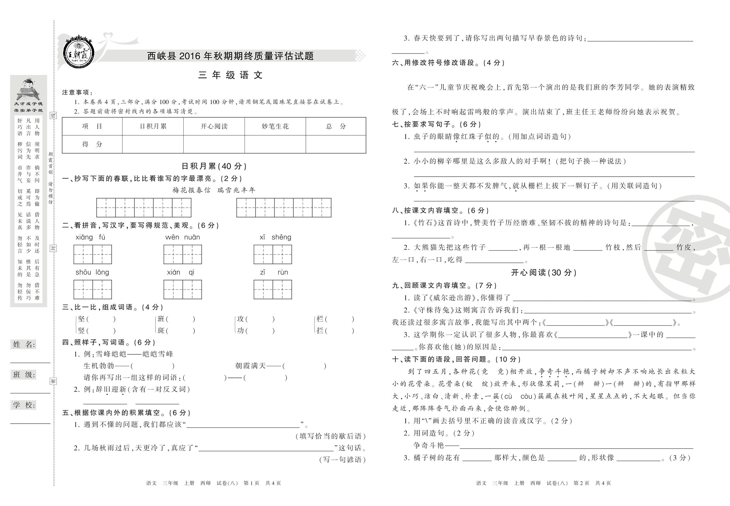 2016-2017学年第一学期南阳市西峡县三年级语文试卷(西师版)【8】