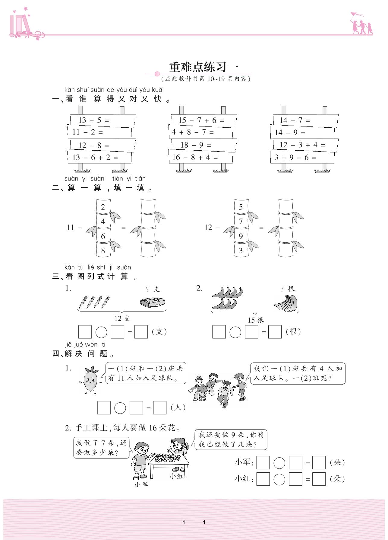 2021下册一年级数学人教版 2 20以内的退位减法——重难点练习一