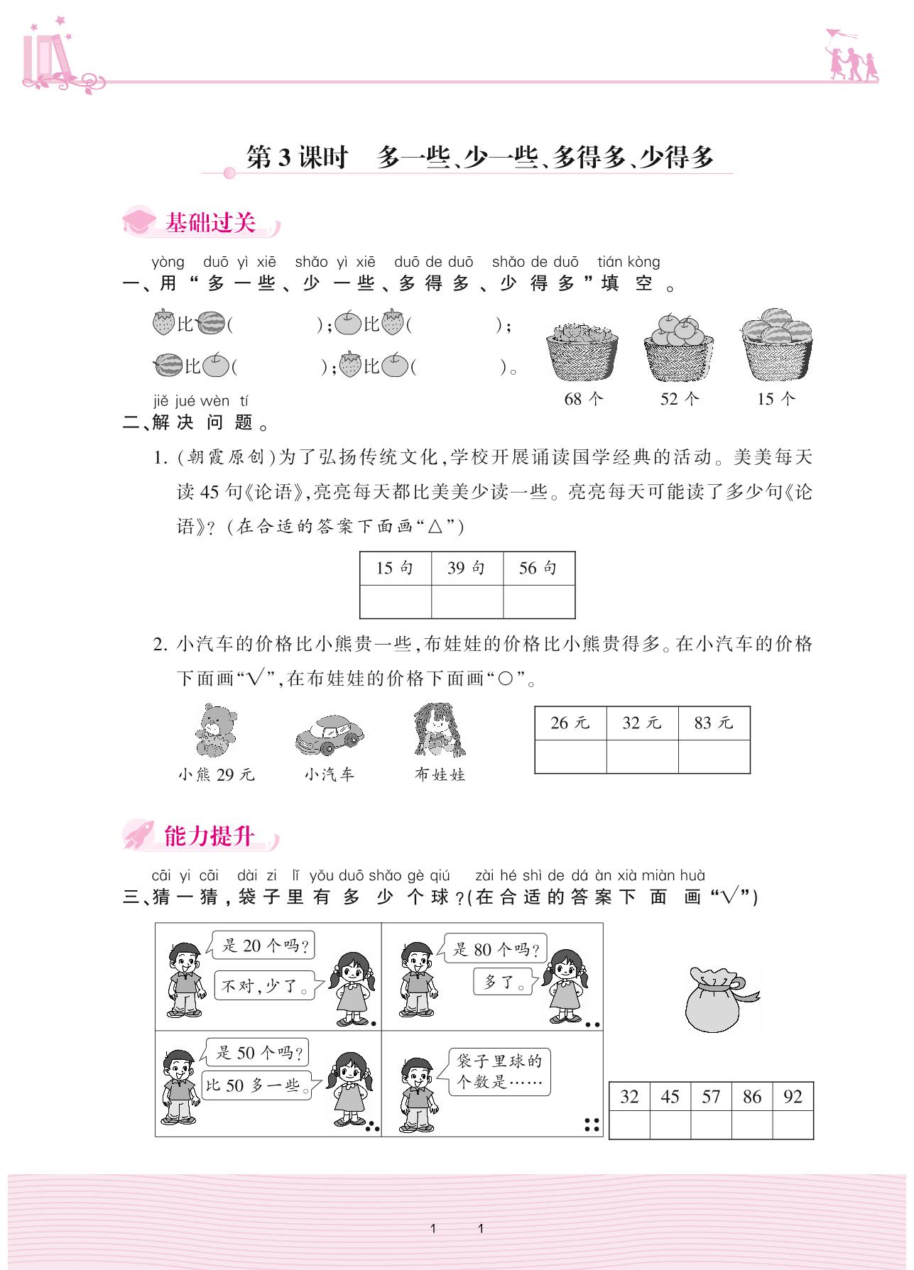 2021下册一年级数学人教版 4 100以内数的认识 2. 数的顺序 比较大小——第3课时 多一些、少一些、多得多、少得多