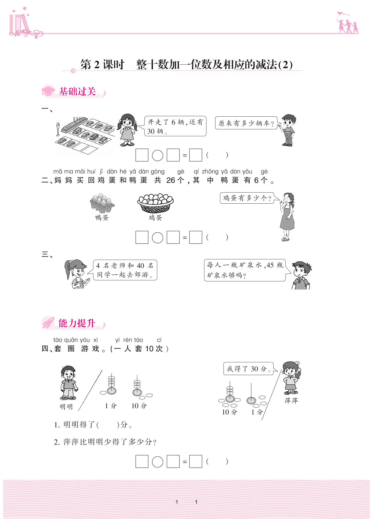 2021下册一年级数学人教版 4 100以内数的认识 4. 整十数加一位数及相应的减法——第2课时 整十数加一位数及相应的减法(2)