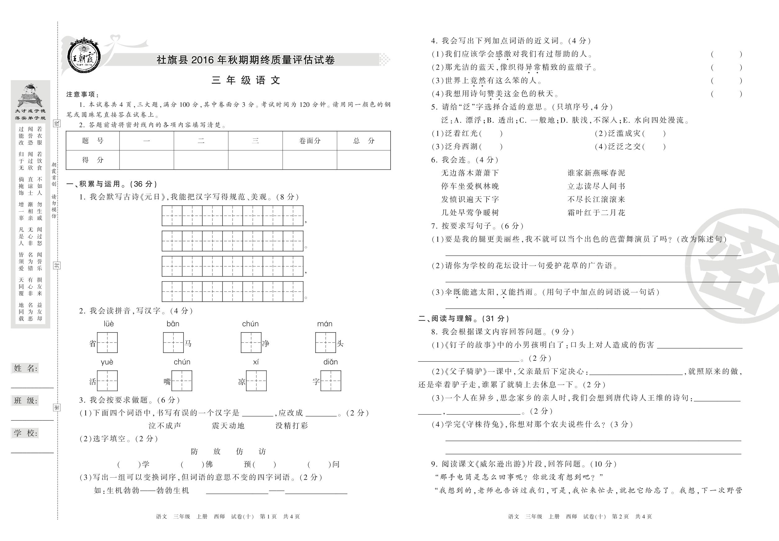 2016-2017学年第一学期南阳市社旗县三年级语文试卷(西师版)【10】