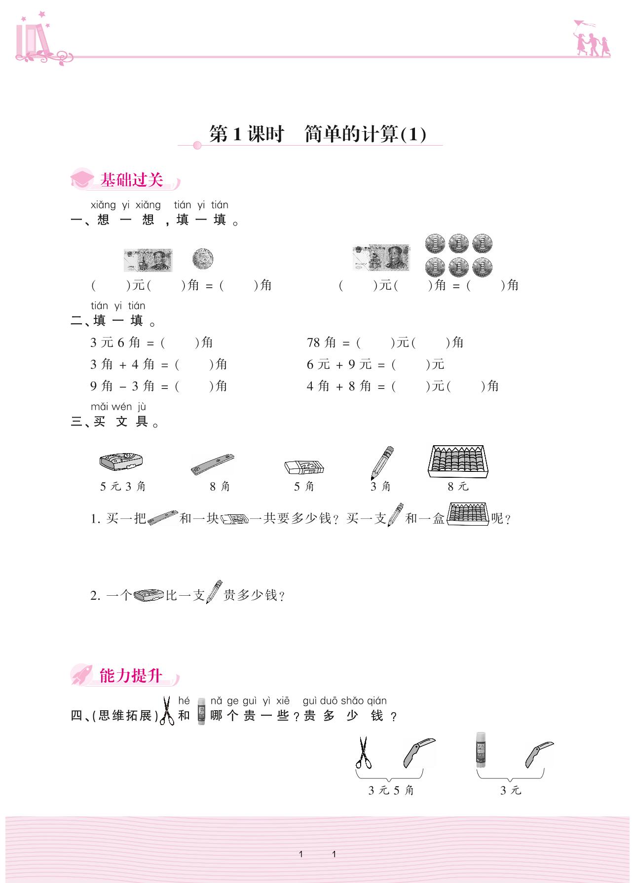2021下册一年级数学人教版 5 认识人民币 2. 简单的计算——第1课时 简单的计算(1)