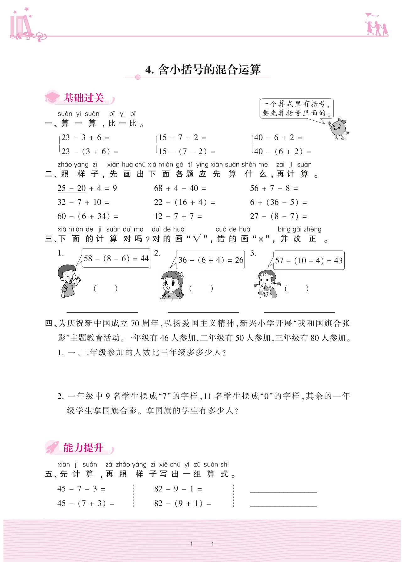 2021下册一年级数学人教版 6 100以内的加法和减法(一) 4. 含小括号的混合运算