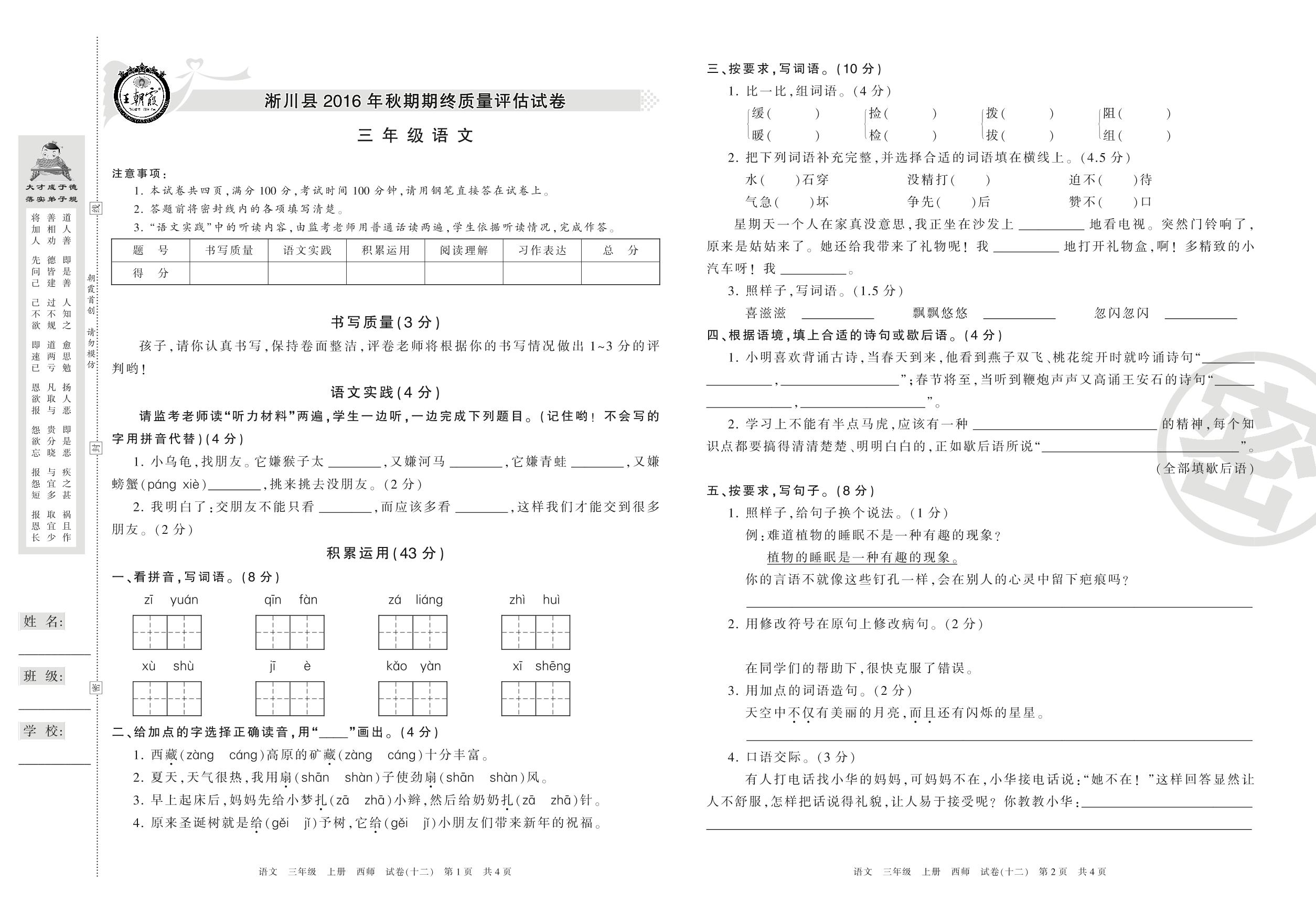 2016-2017学年第一学期南阳市淅川县三年级语文试卷(西师版)【12】
