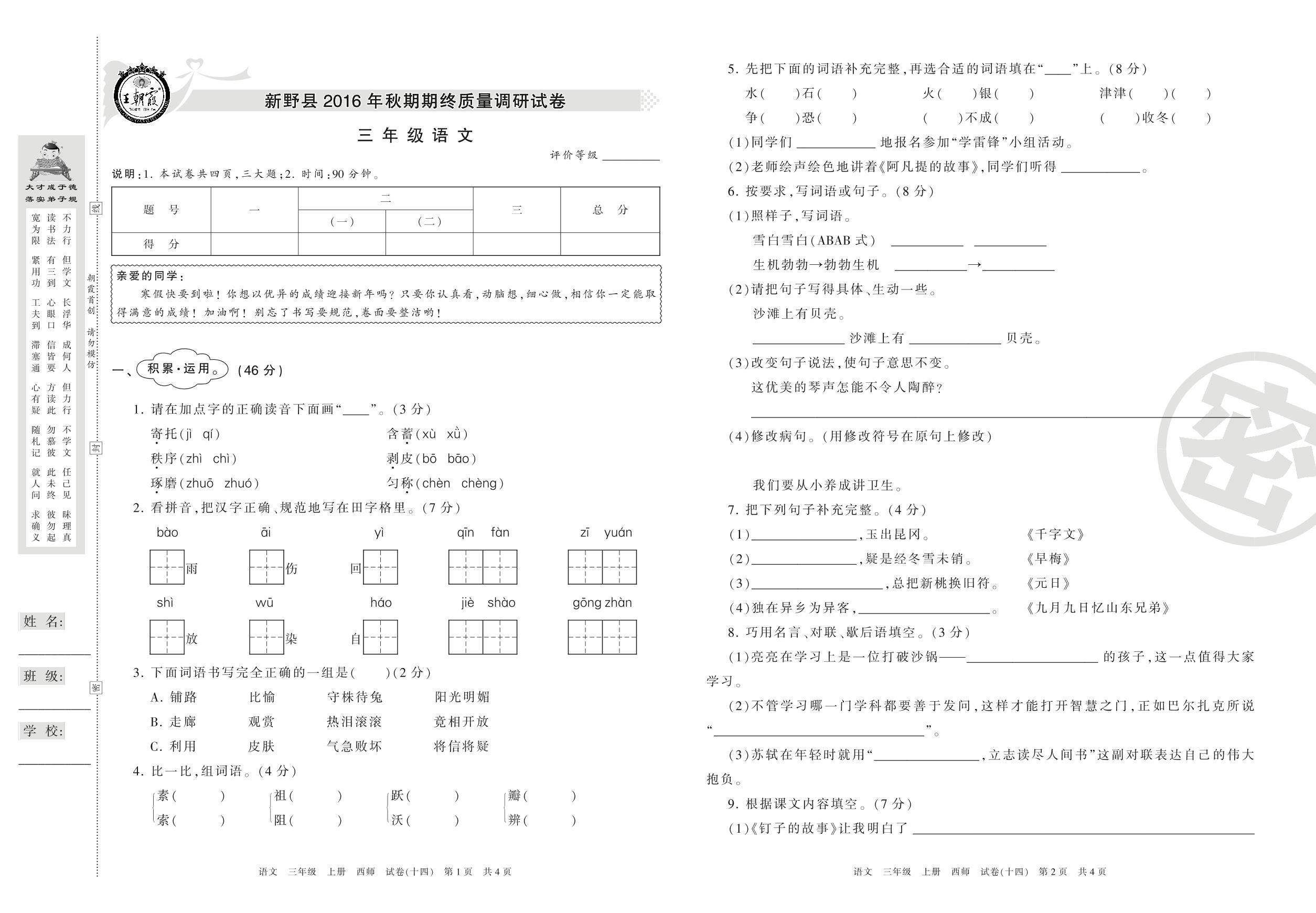 2016-2017学年第一学期南阳市新野县三年级语文试卷(西师版)【14】