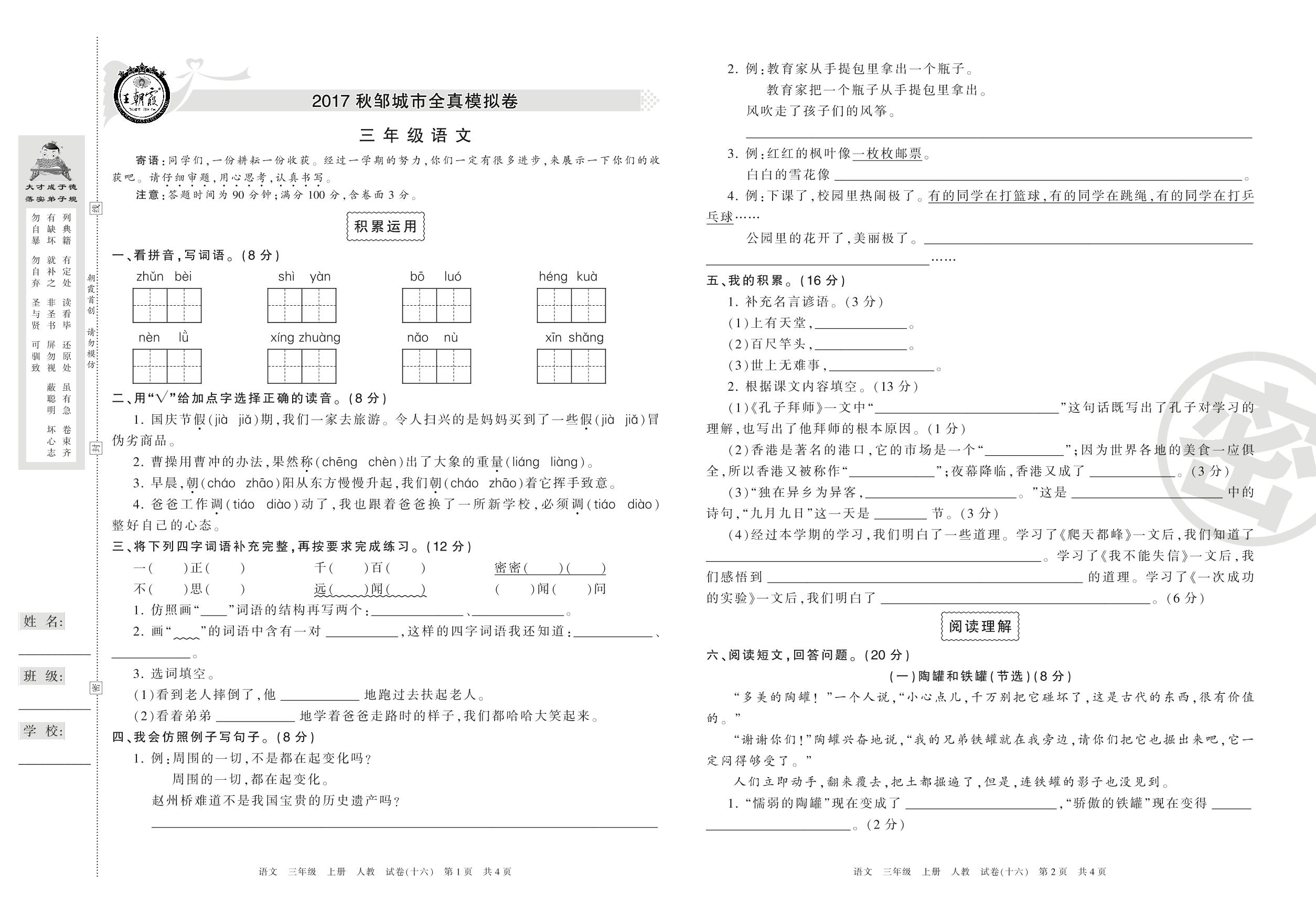 邹城市模拟卷三年级上册语文(人教版)【16】