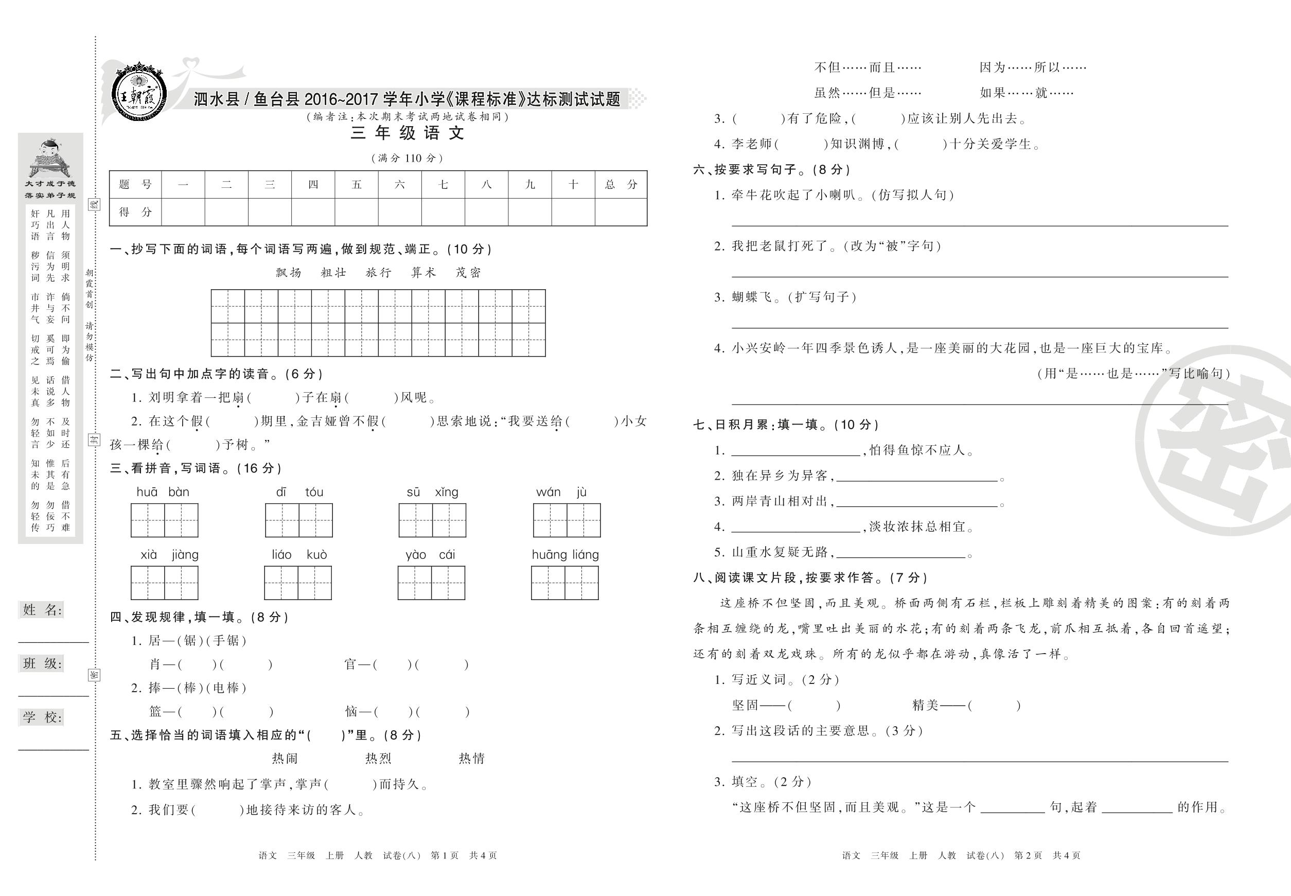 2016-2017学年第一学期济宁市泗水县、鱼台县三年级语文试卷(人教版)【8】