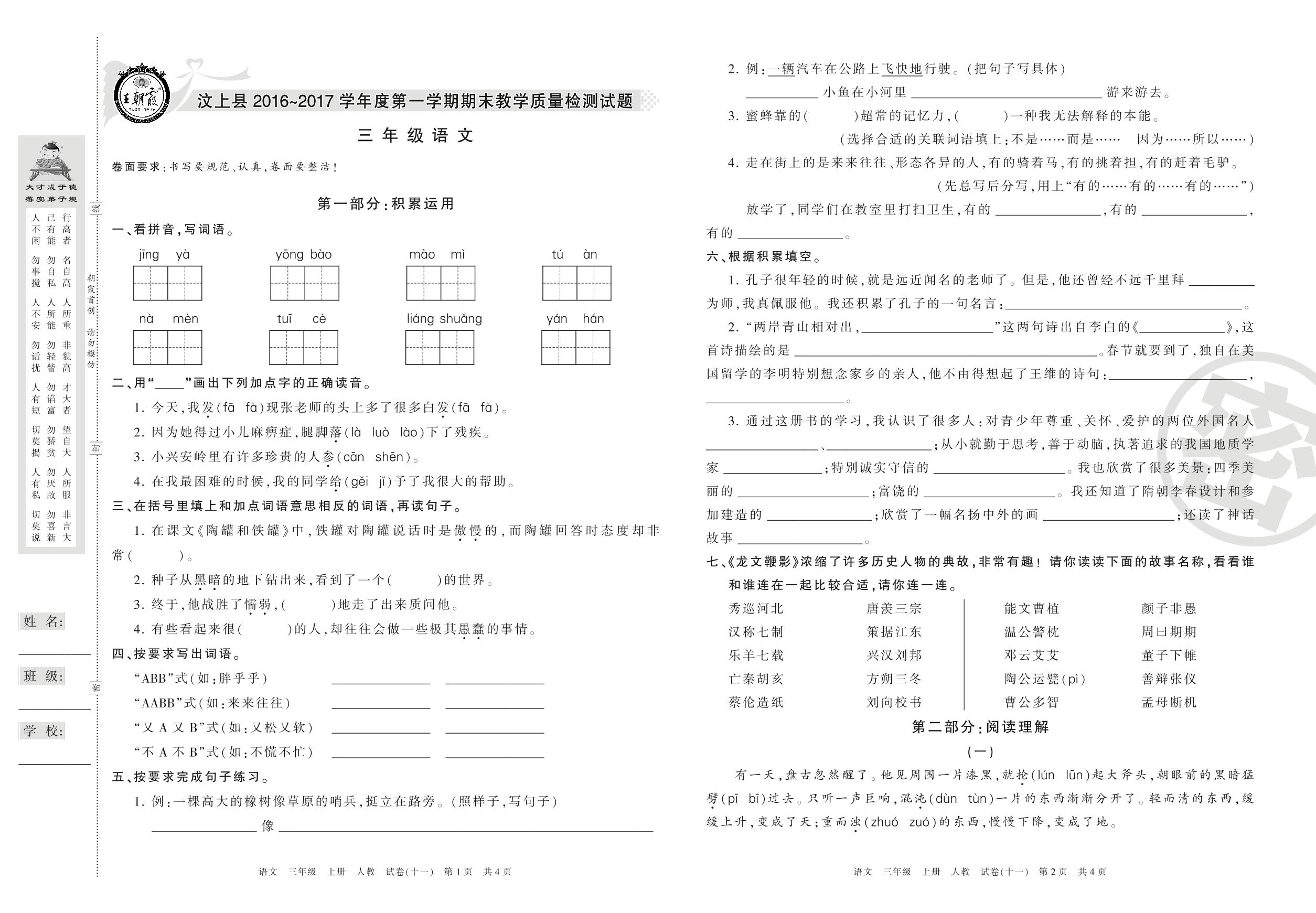 2016-2017学年第一学期济宁市汶上县三年级语文试卷(人教版)【11】