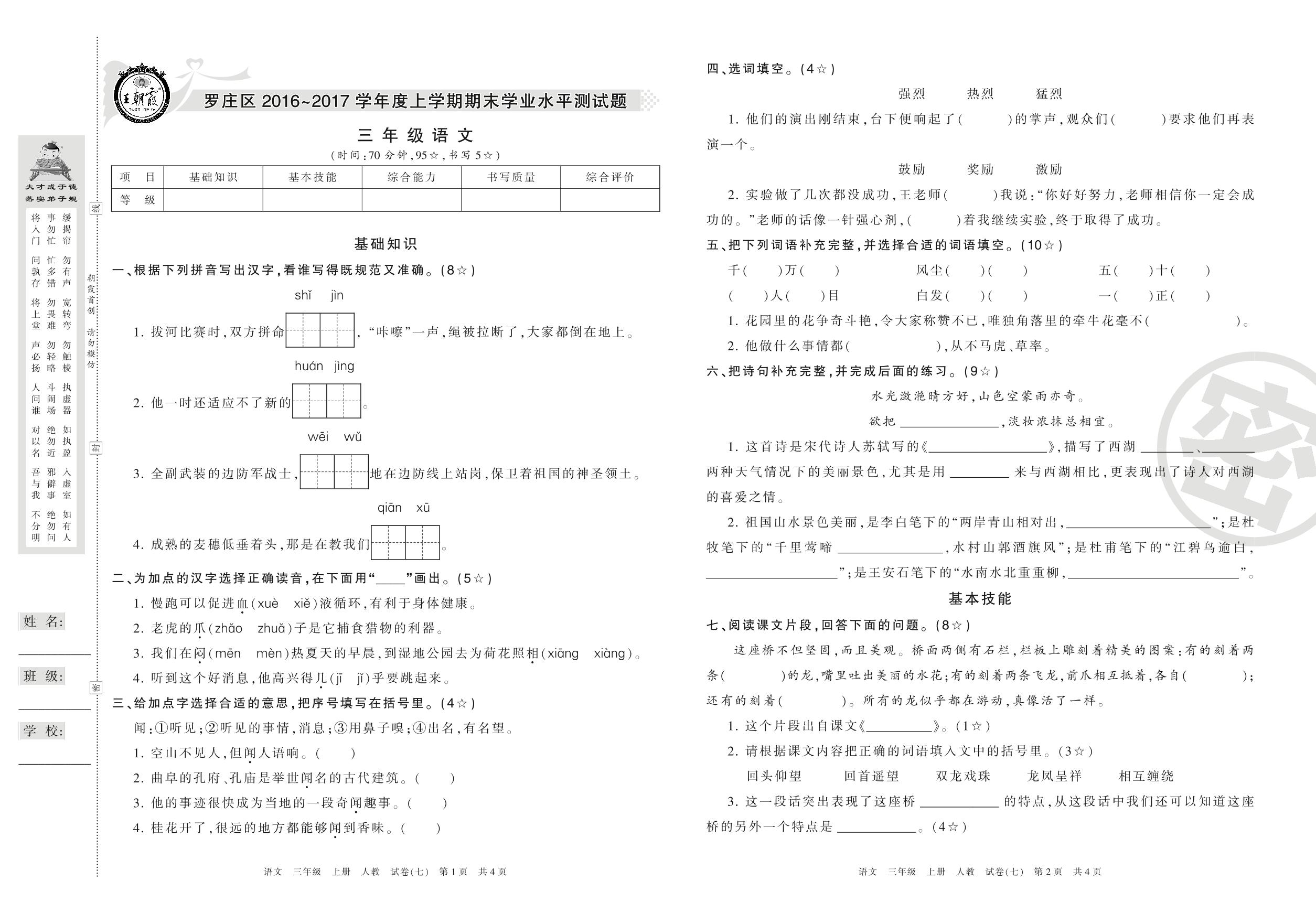 2016-2017学年第一学期临沂市罗庄区三年级语文试卷(人教版)【7】