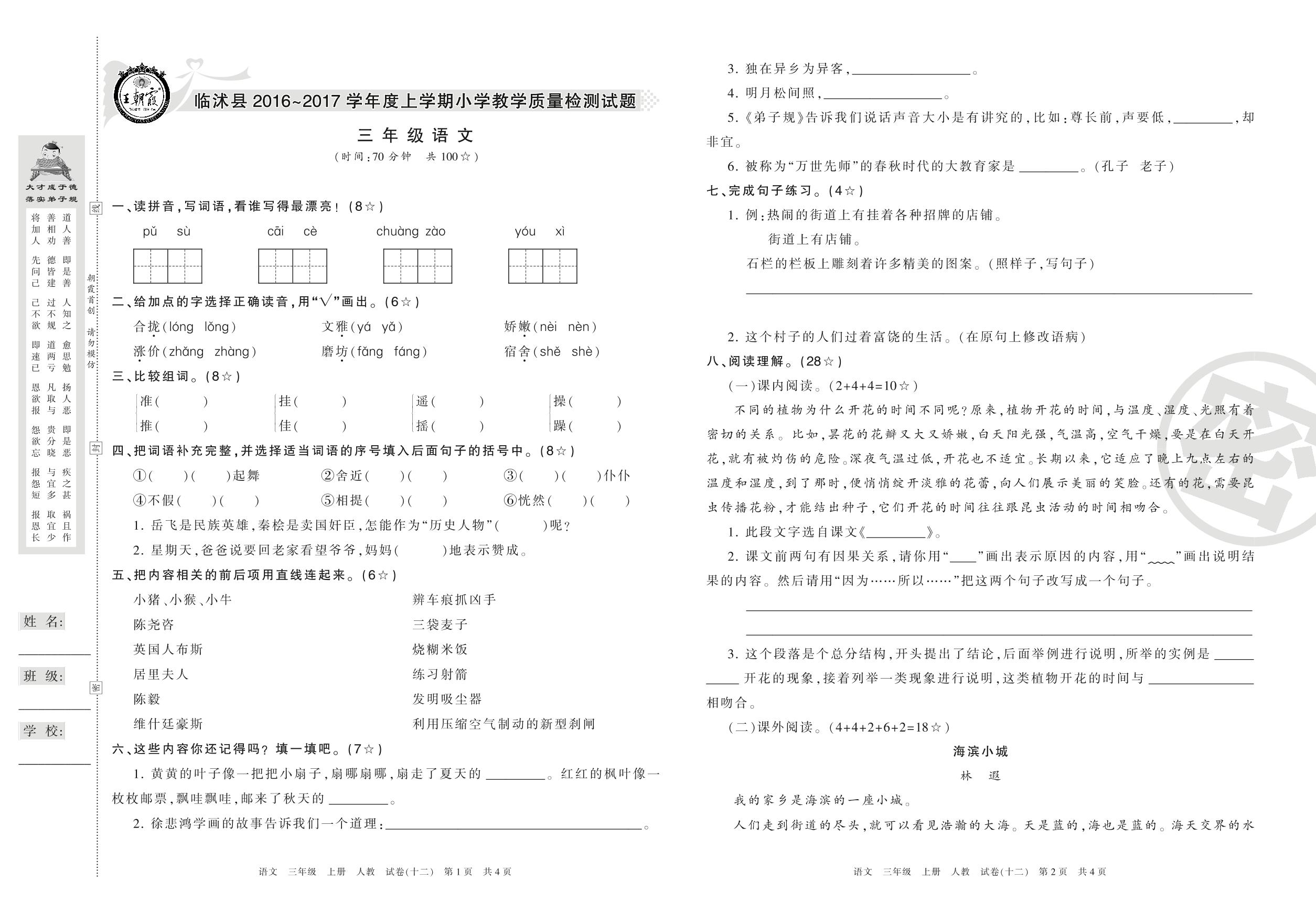 2016-2017学年第一学期临沂市临沭县三年级语文试卷(人教版)【12】