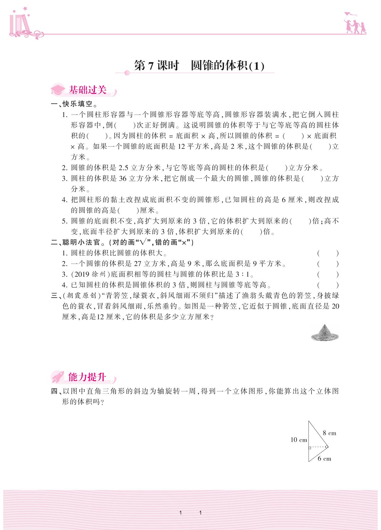 2021下册六年级数学苏教版 二 圆柱和圆锥——第7课时 圆锥的体积(1)