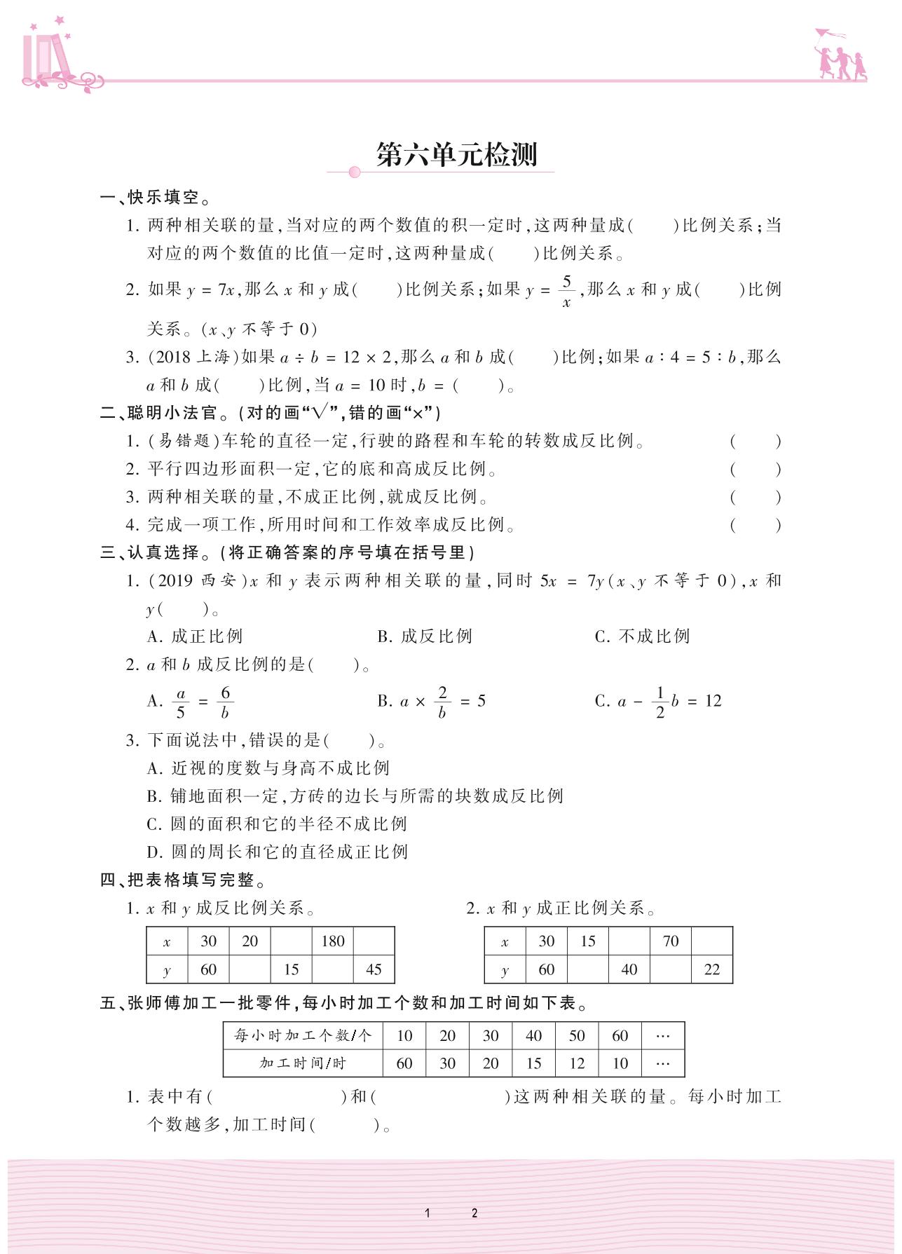 2021下册六年级数学苏教版 六 正比例和反比例——第六单元检测