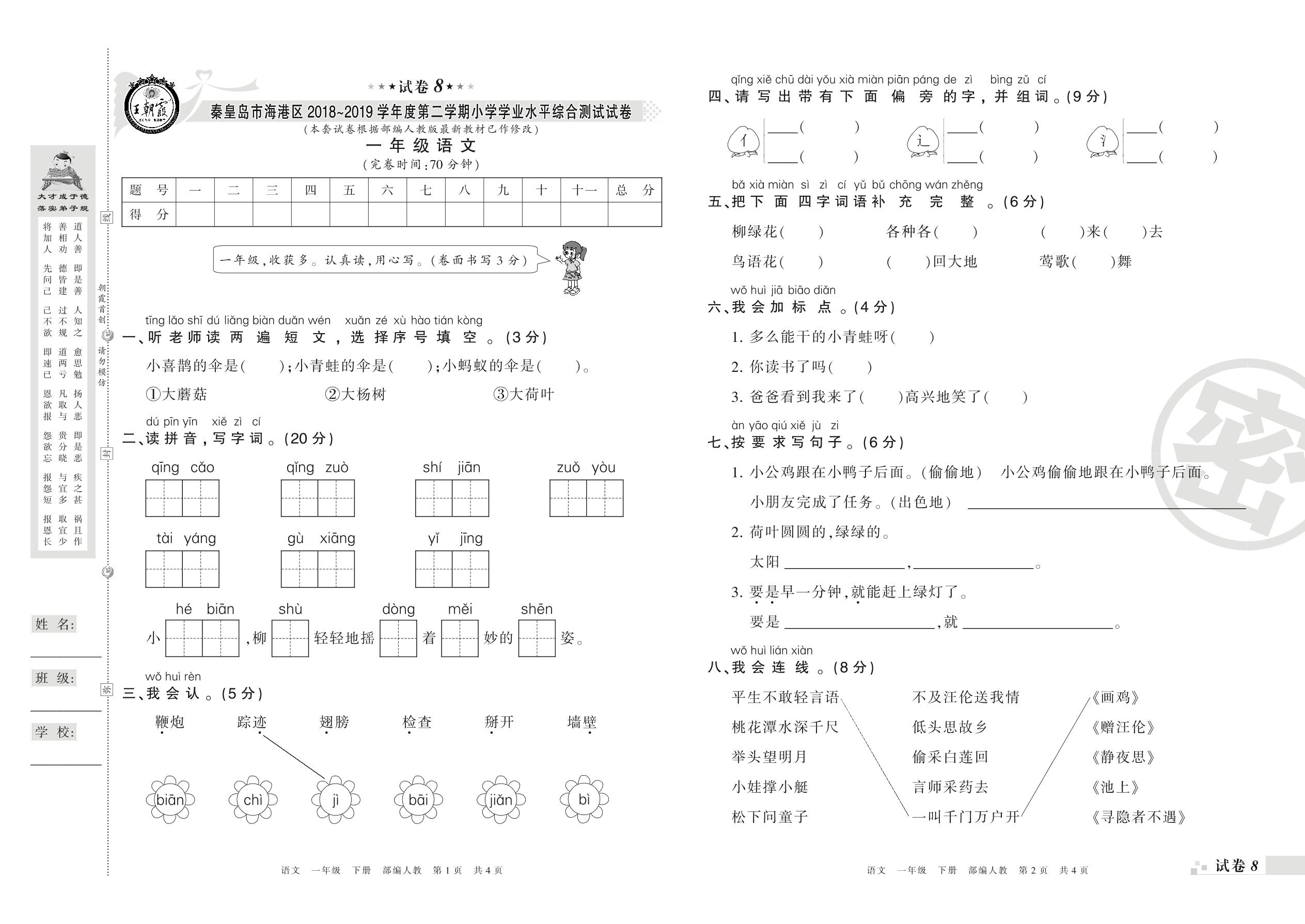2018-2019学年第二学期秦皇岛市海港区一年级语文试卷(人教版)【8】