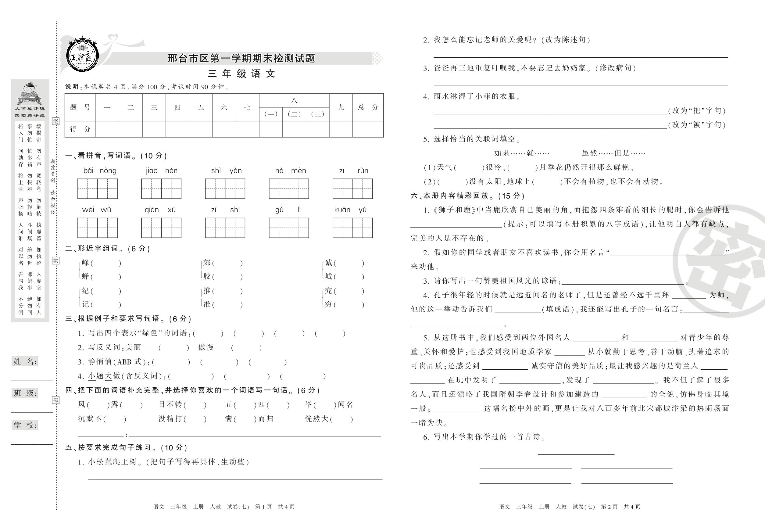 三年级语文人教版上册期末卷
