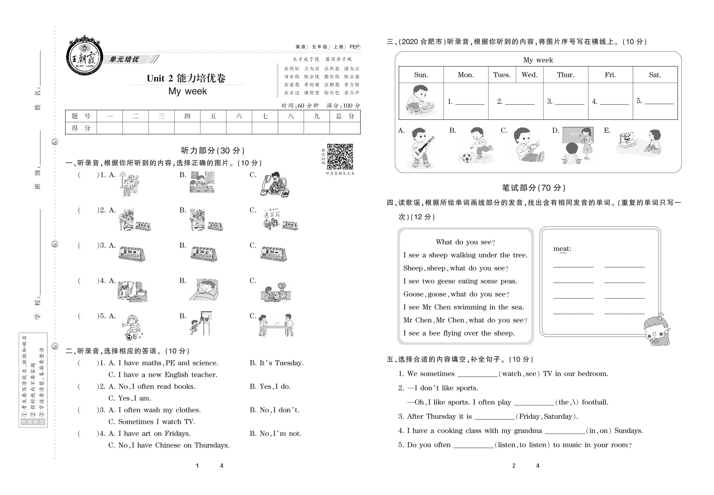 2020上册五年级英语PEP版 Unit 2 能力培优卷