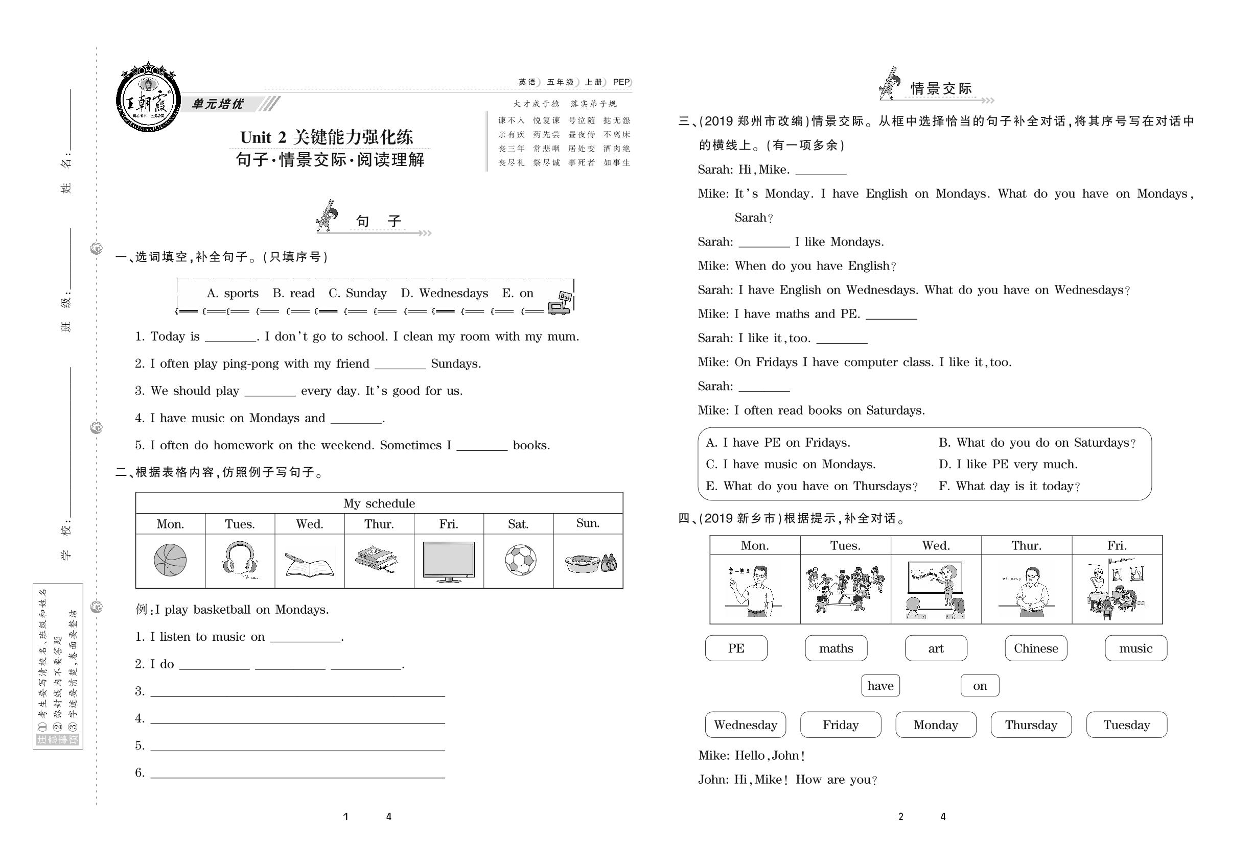 2020上册五年级英语PEP版 Unit 2 关键能力强化练