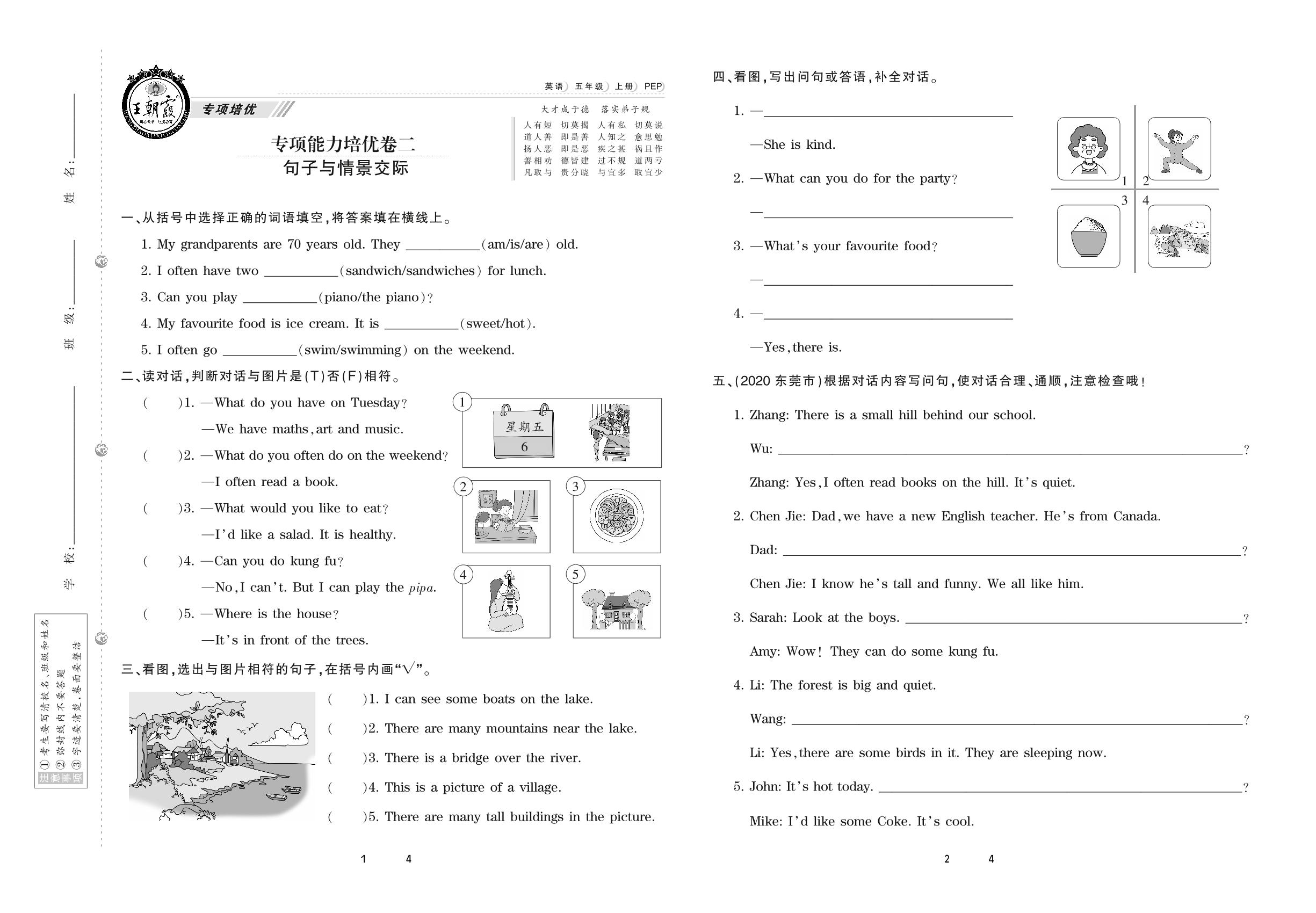 2020上册五年级英语PEP版 专项能力培优卷二 句子与情景交际