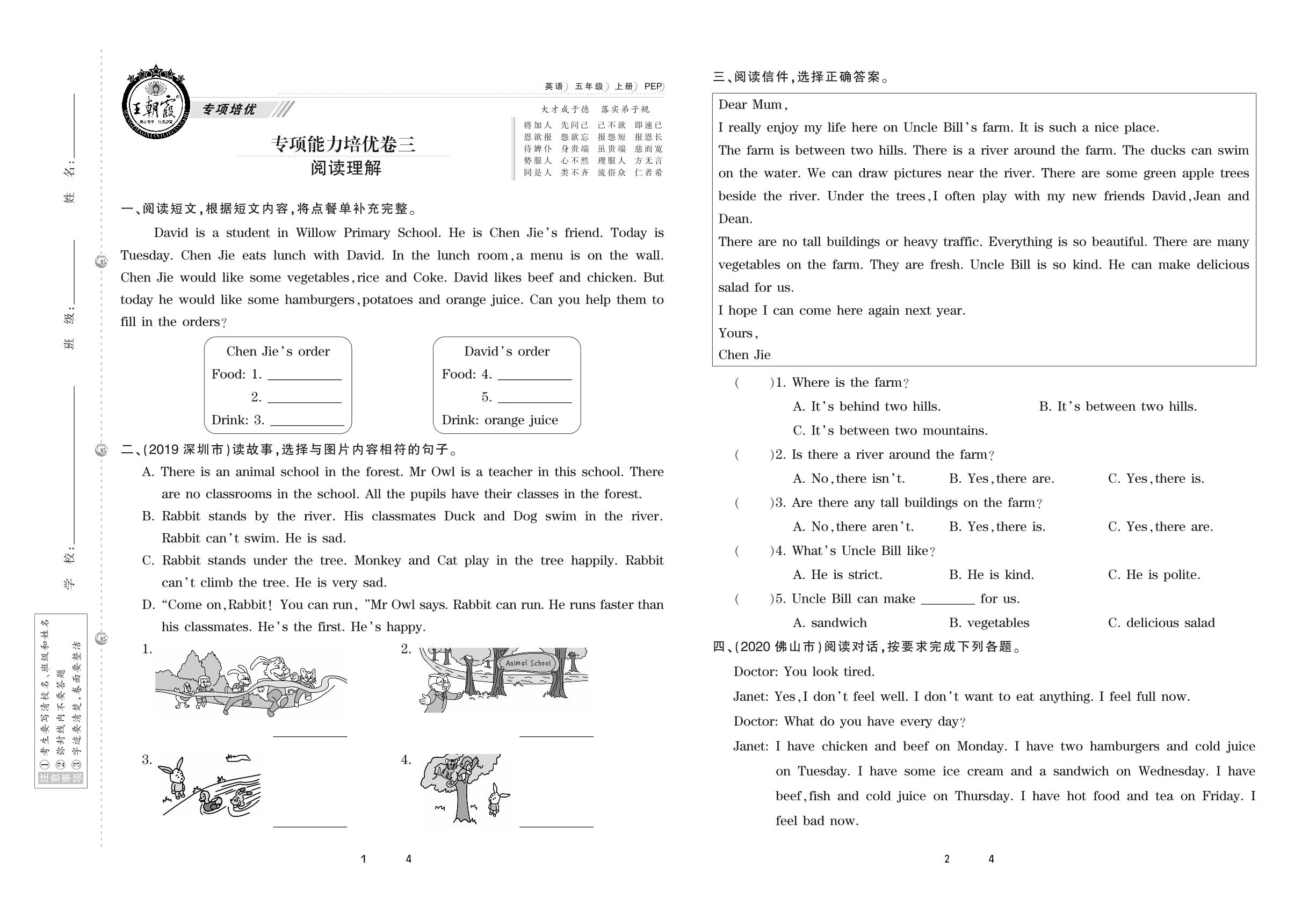 2020上册五年级英语PEP版 专项能力培优卷三 阅读理解