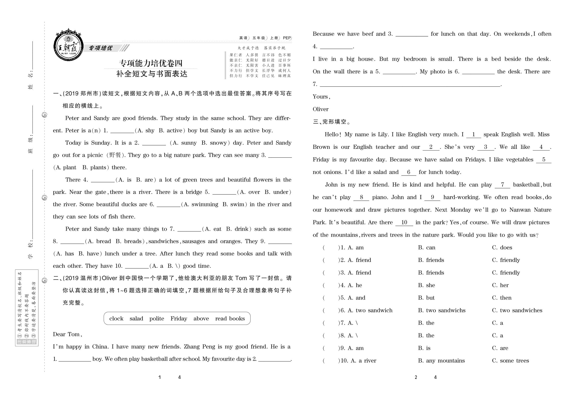 2020上册五年级英语PEP版 专项能力培优卷四 补全短文与书面表达