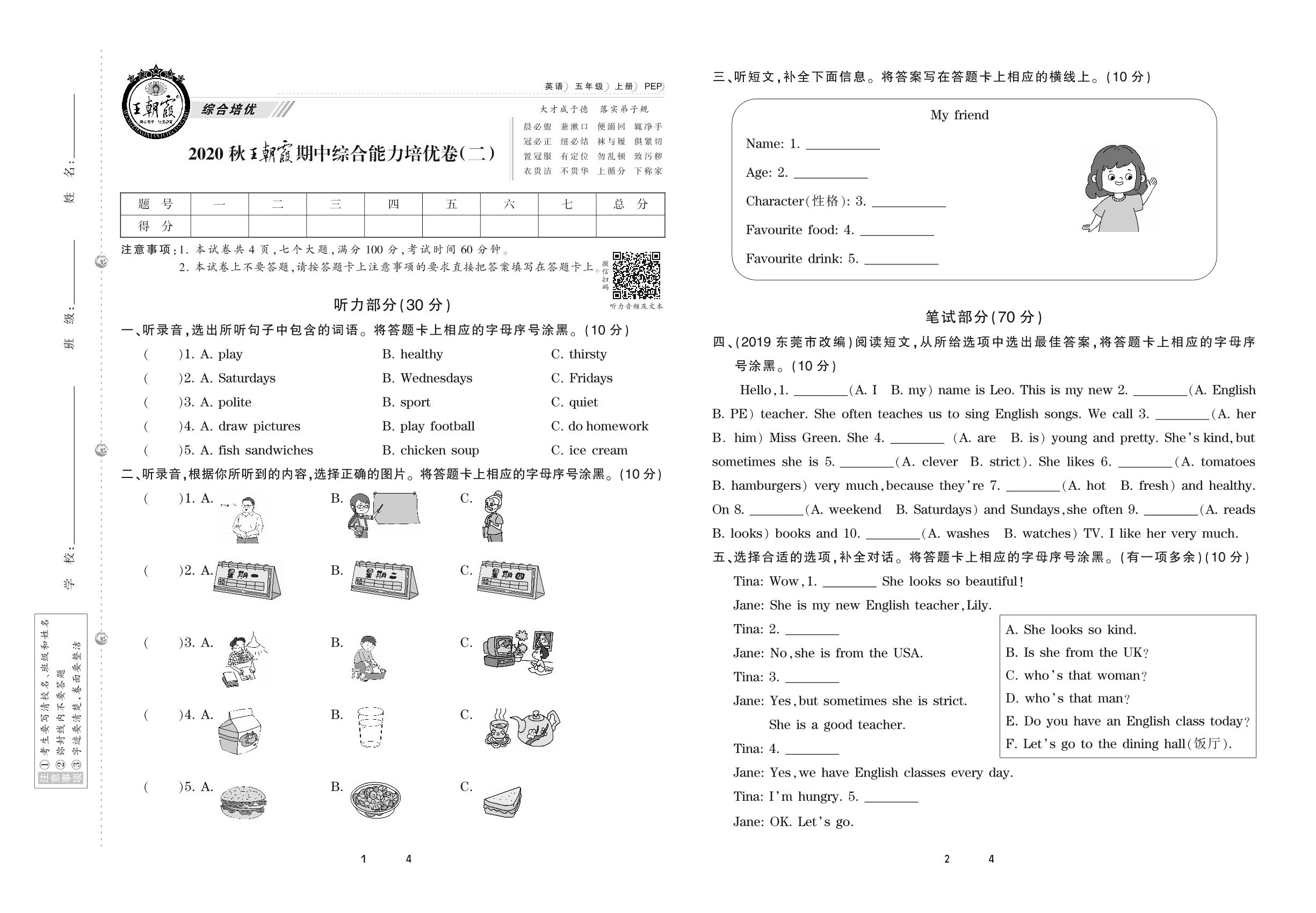 2020上册五年级英语PEP版 王朝霞期中综合能力培优卷(二)