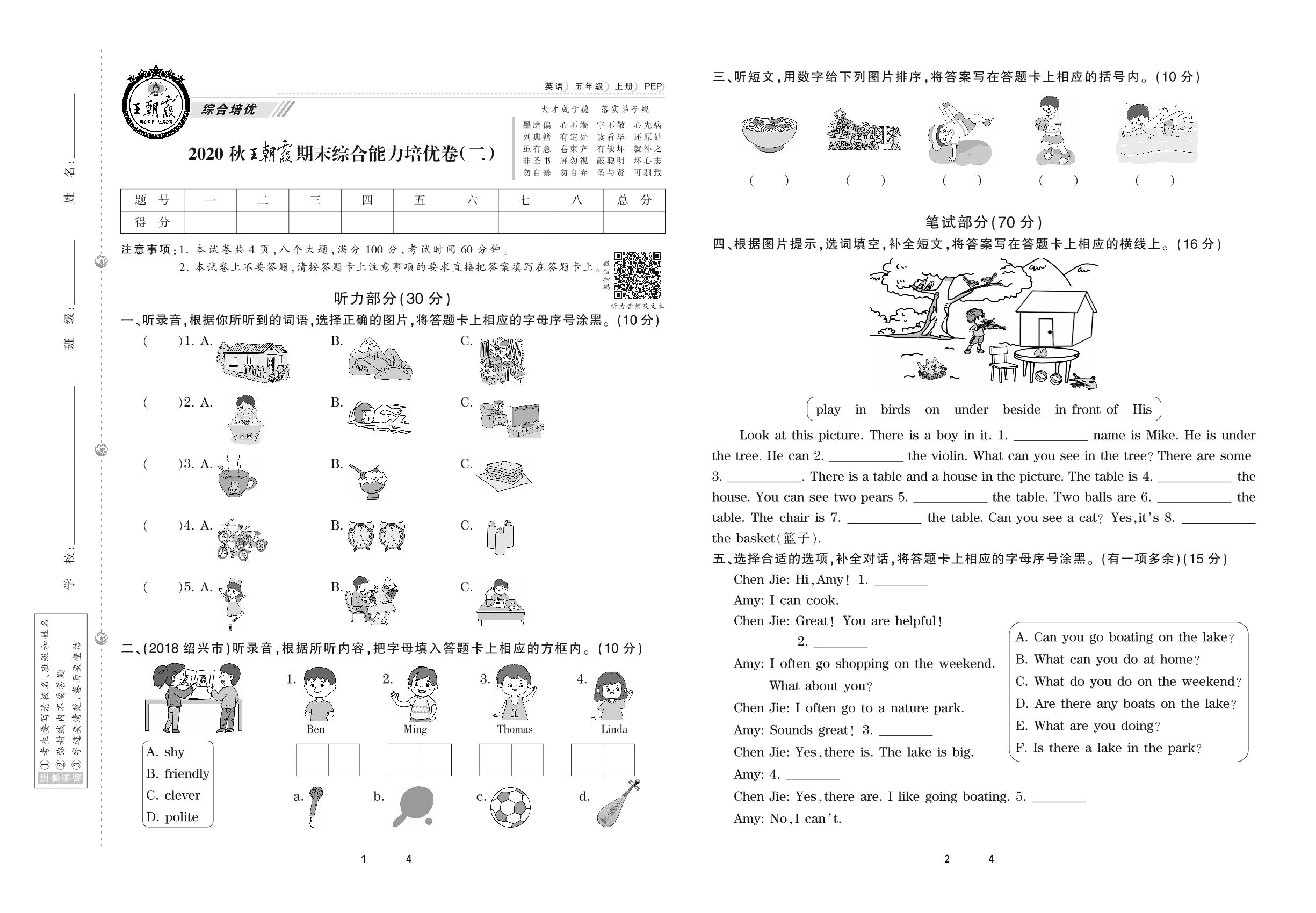 2020上册五年级英语PEP版 王朝霞期末综合能力培优卷(二)