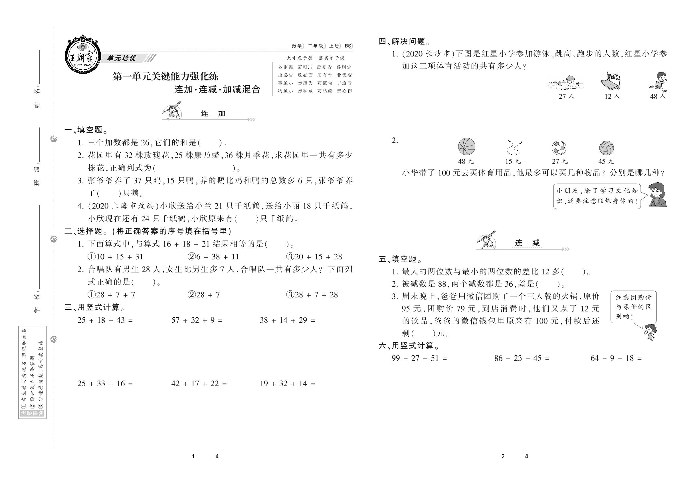 2020上册二年级数学北师版 第一单元 关键能力强化练