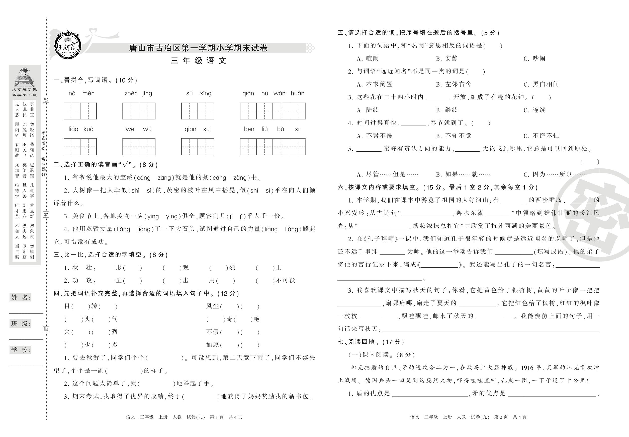 2016-2017学年第一学期唐山市古冶区三年级语文试卷(人教版)【9】