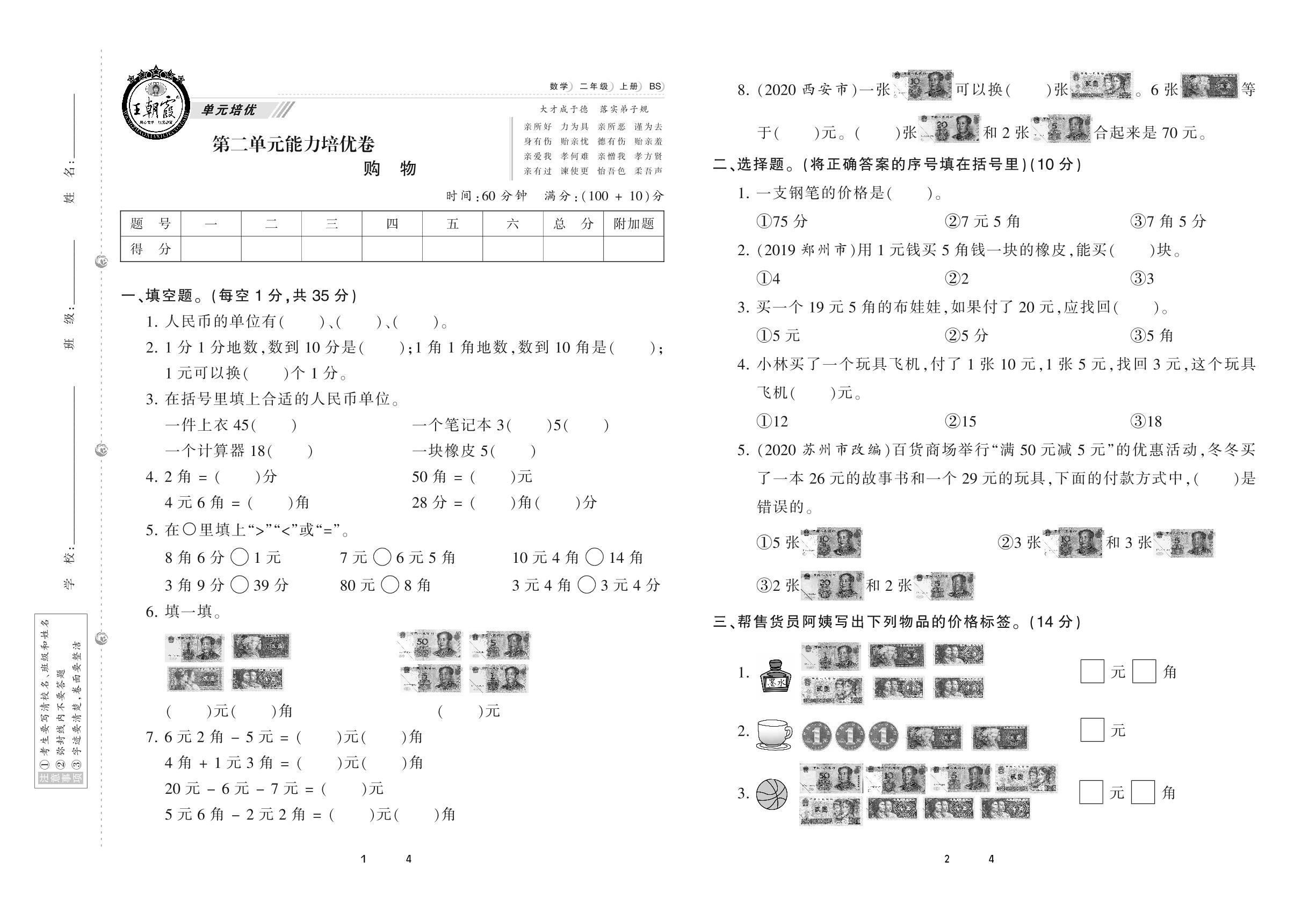2020上册二年级数学北师版 第二单元 能力培优卷