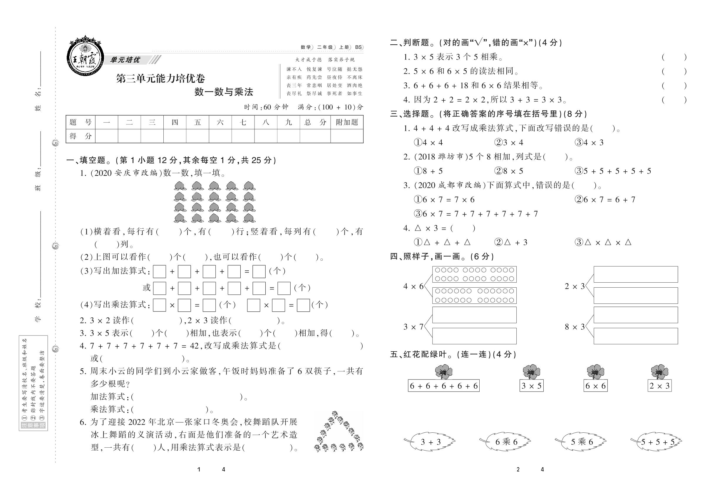 2020上册二年级数学北师版 第三单元 能力培优卷