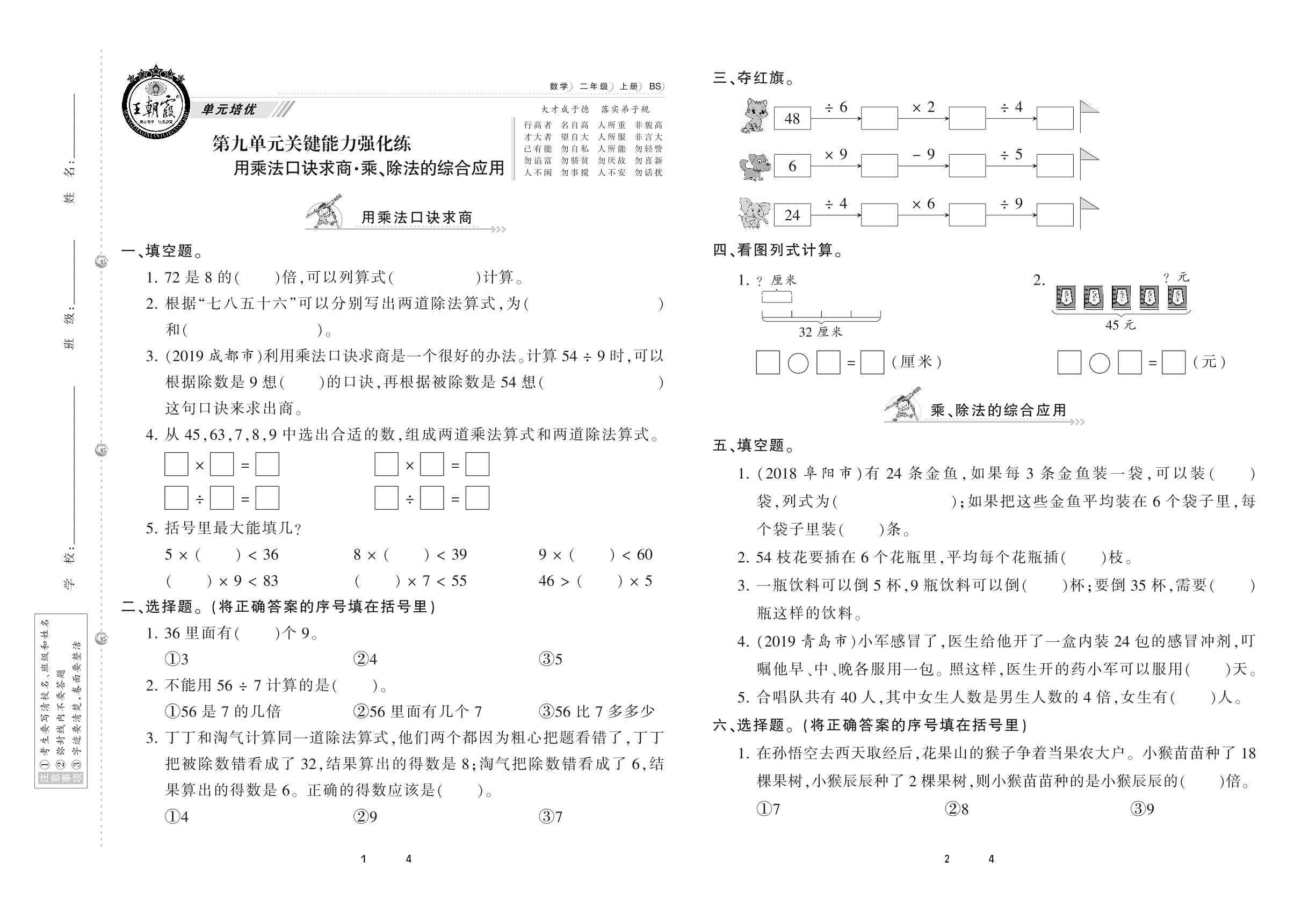 2020上册二年级数学北师版 第九单元 关键能力强化练