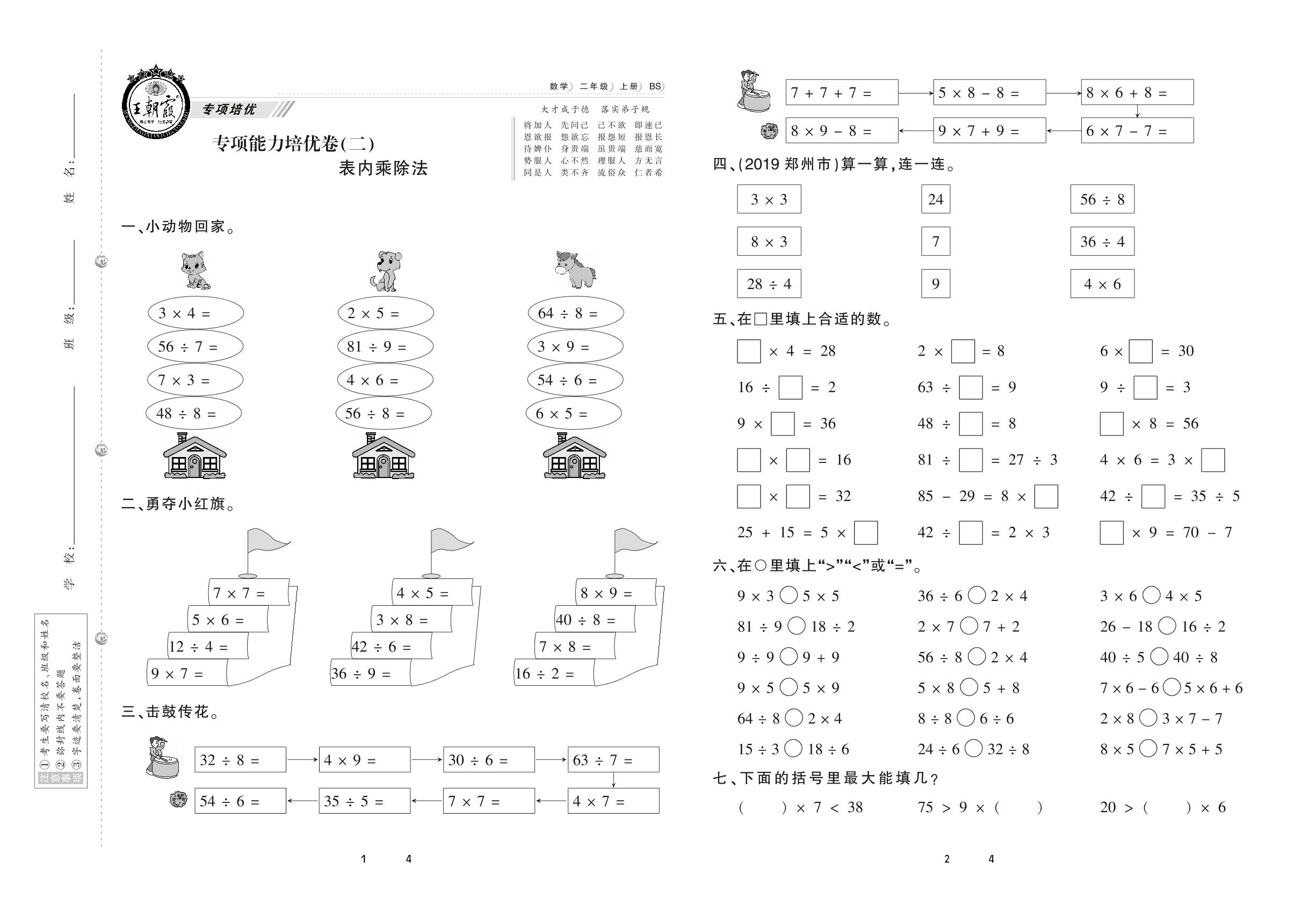 2020上册二年级数学北师版 专项能力培优卷(二) 表内乘除法