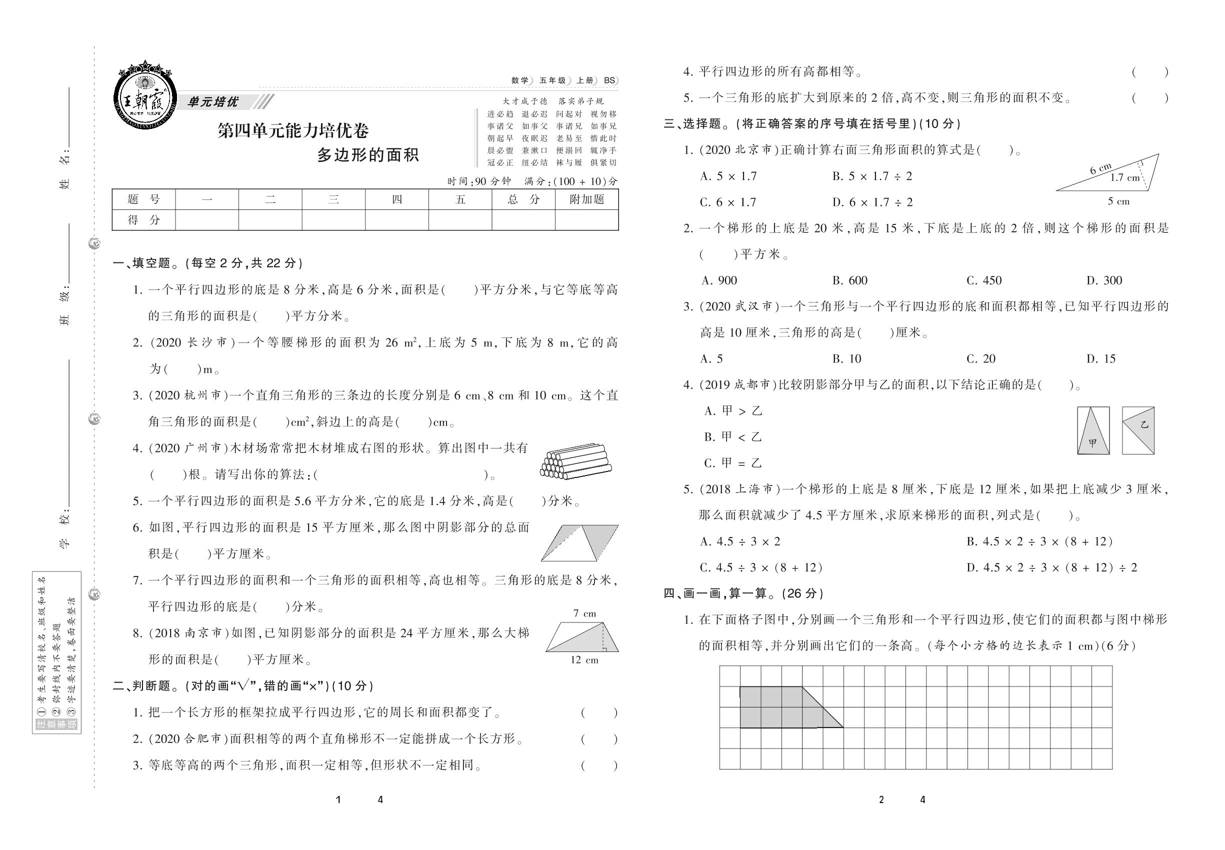 2020上册五年级数学北师版 第四单元 能力培优卷