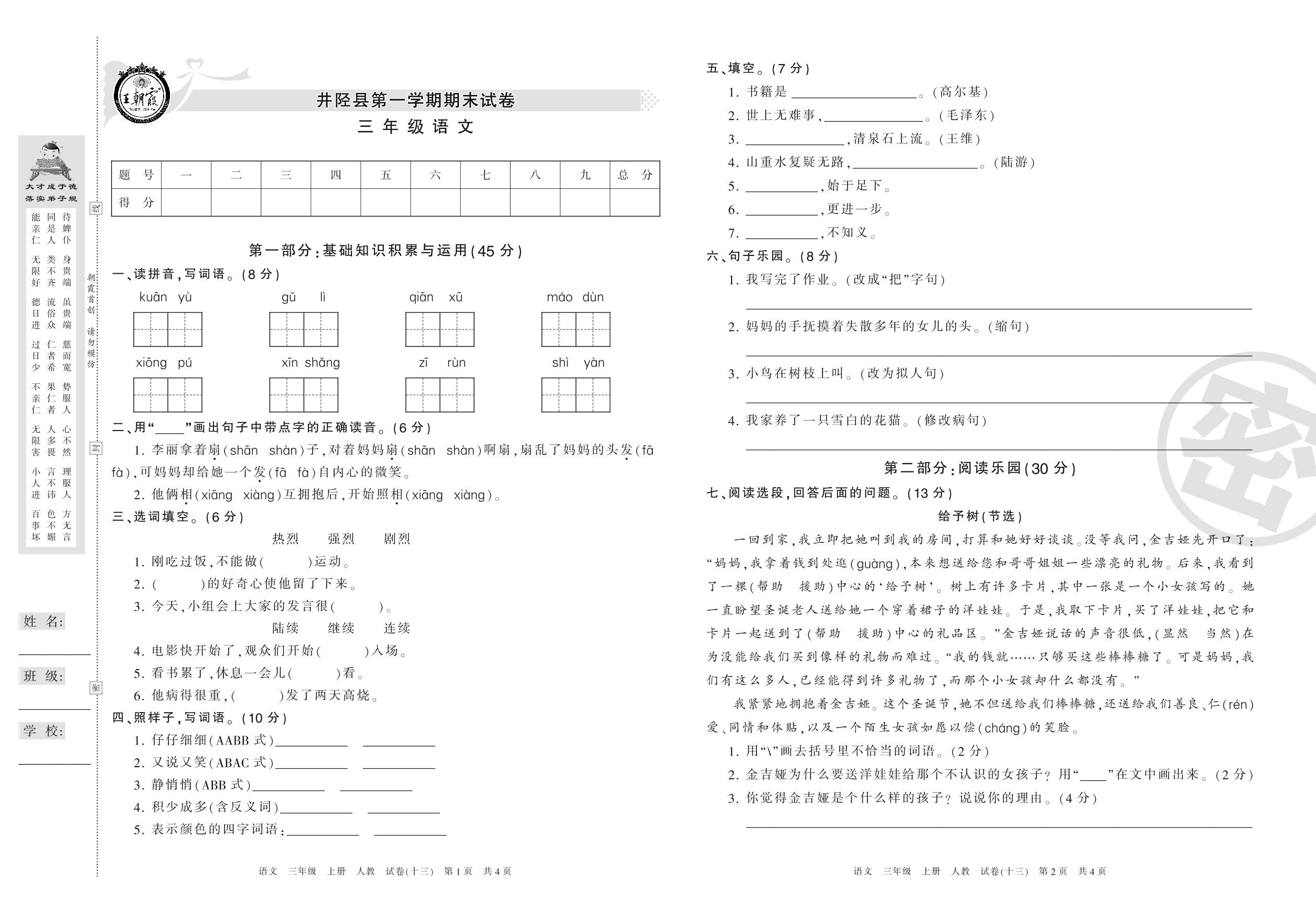 2016-2017学年第一学期石家庄市井陉县三年级语文试卷(人教版)【13】