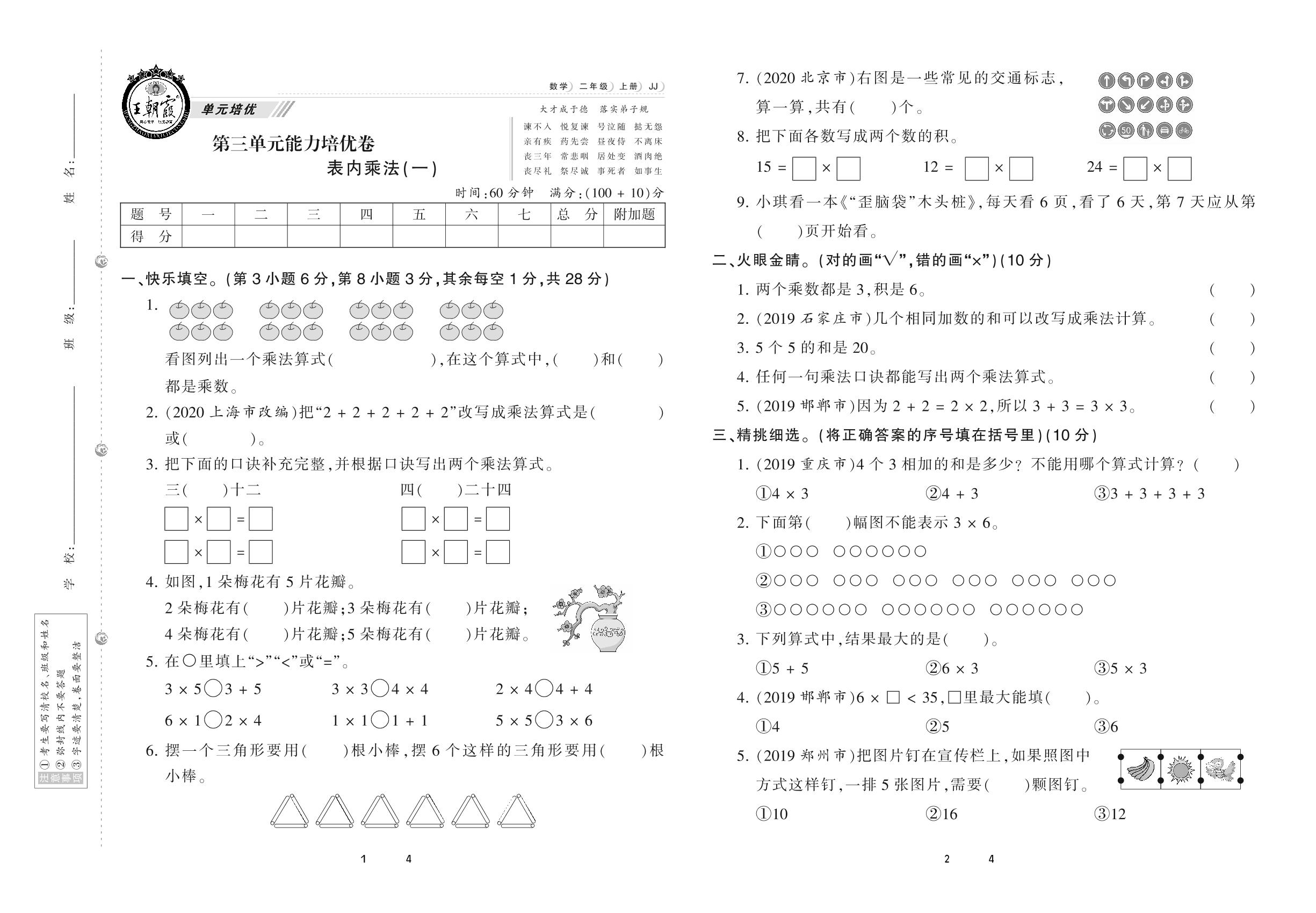 2020上册二年级数学冀教版 第三单元 能力培优卷