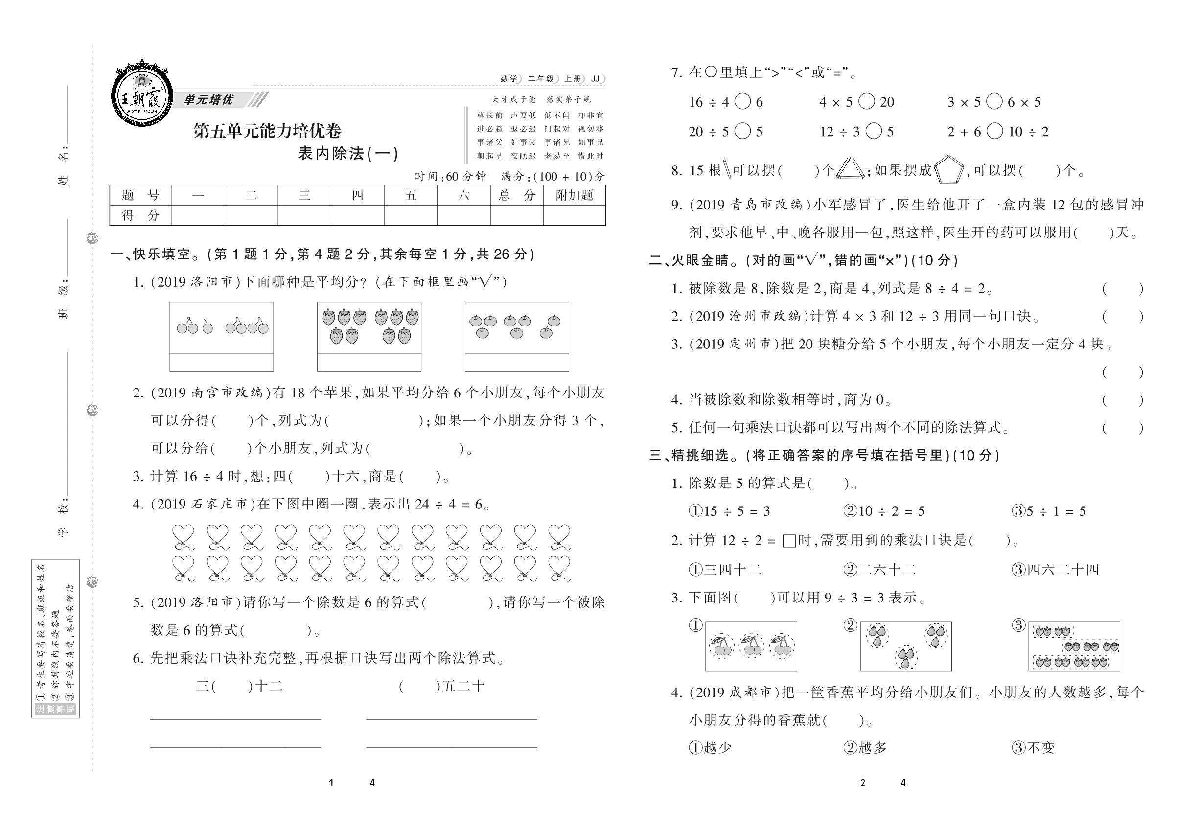 2020上册二年级数学冀教版 第五单元 能力培优卷